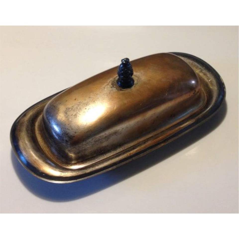 กล่องใส่เนยโลหะสีเงินหรูหราพร้อมฝาปิดและฐานทรงลิ่ม กล่องเก็บเนยสแตนเลสตกแต่งพร้อมช่องใส่ช้อนสำหรับโรงแรม
