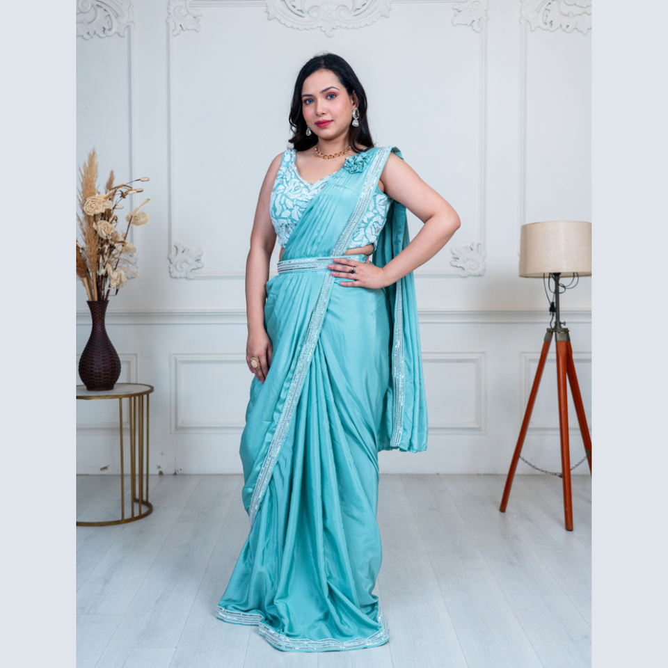 ส่าหรีสีฟ้าหรูหราประดับด้วยไข่มุกและช่างฝีมือเย็บล่วงหน้าสำหรับผู้จำหน่ายที่มีเสน่ห์จากอินเดียขายส่ง