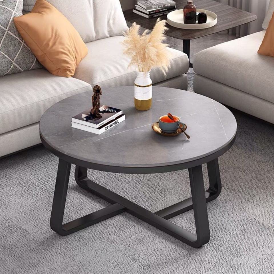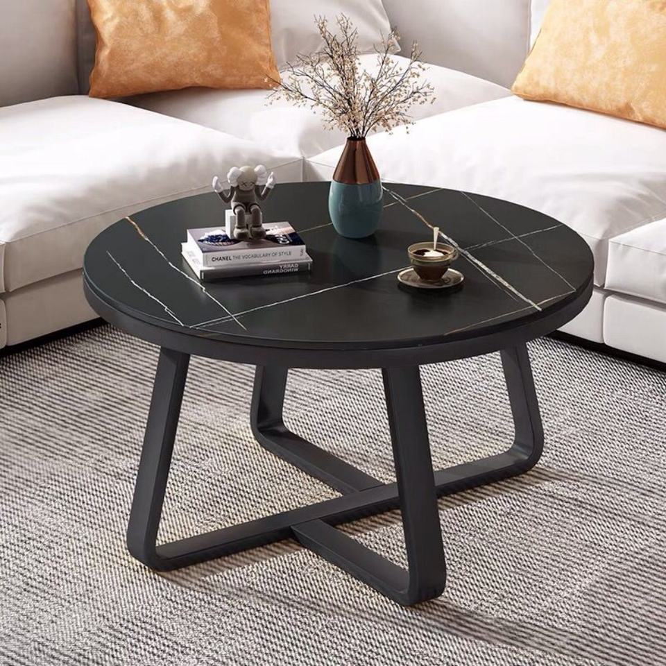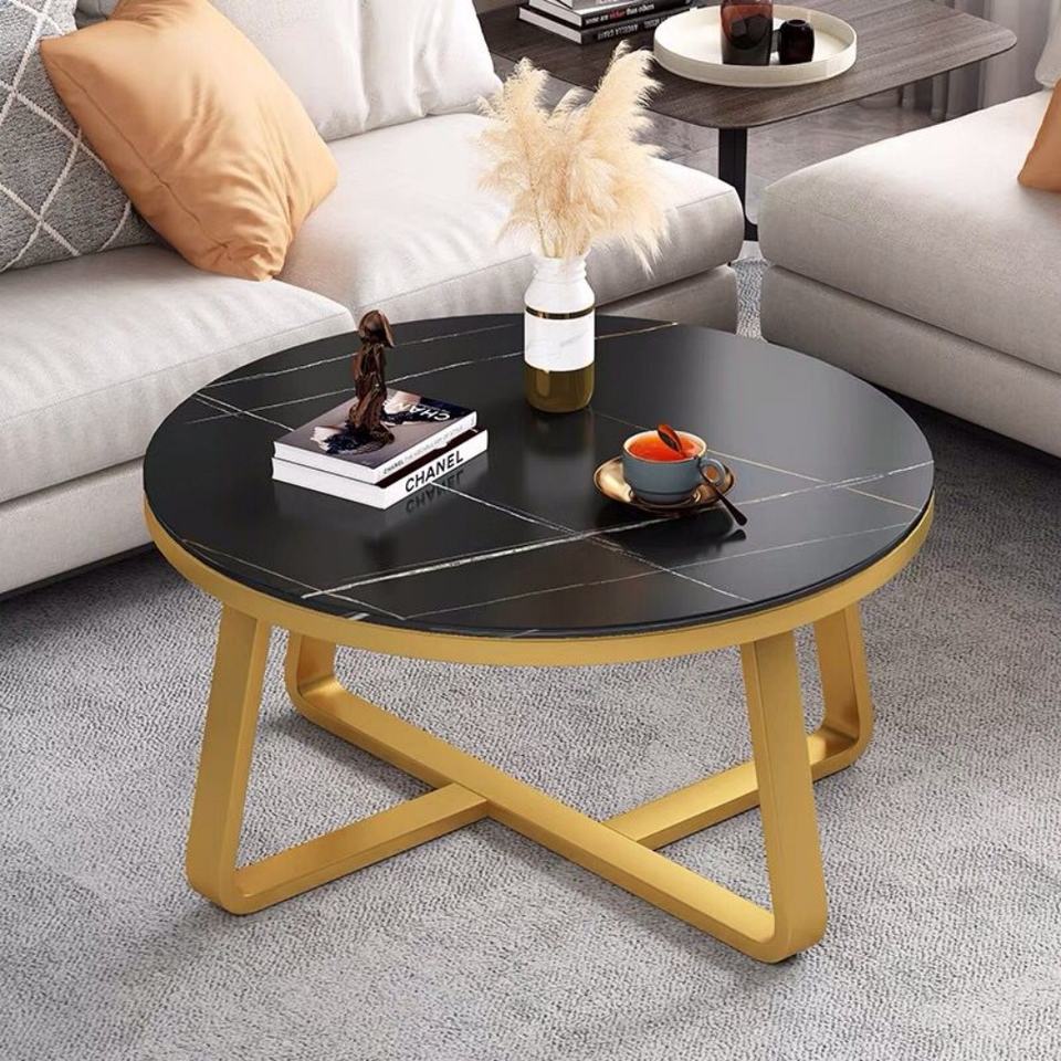 โต๊ะกาแฟทรงกลมขาโลหะหน้าหินชนวนหรูหรา โต๊ะน้ำชาหน้าหินอ่อนทนความร้อนสำหรับห้องนั่งเล่น