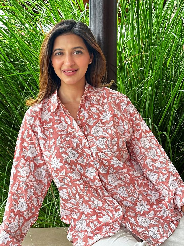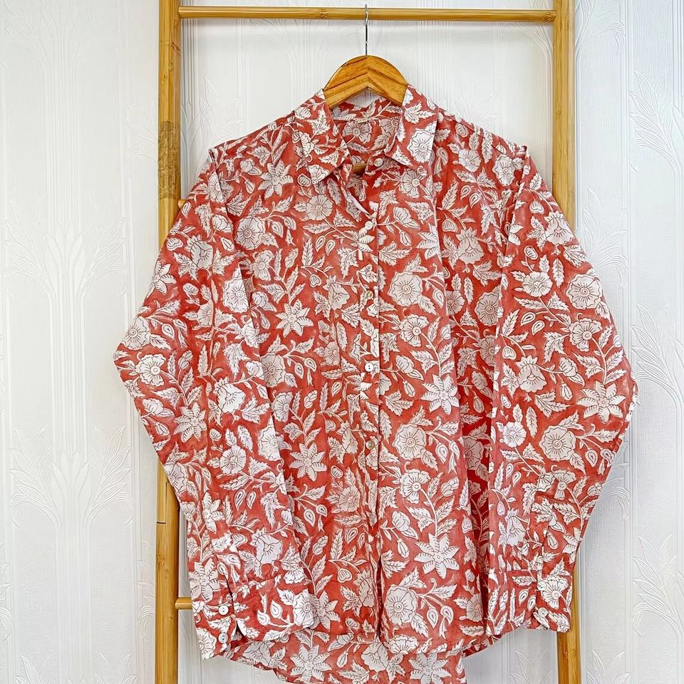 เสื้อแขนกุดคอตตอนเนื้อนุ่มหรูหราลายดอกพีชสีขาวลายดอกแบบอินเดียเสื้อเชิ้ตสั้นสำหรับกลางวันใส่ในฤดูร้อน