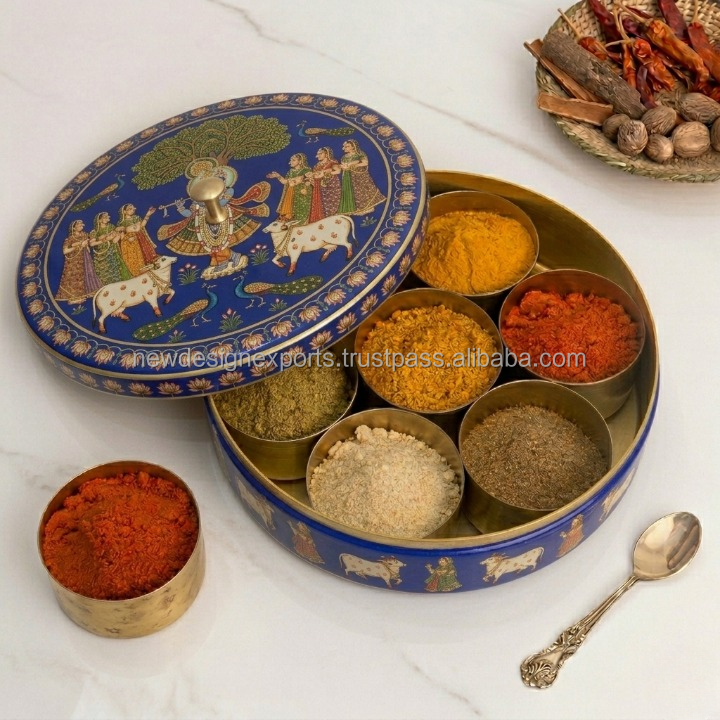 กล่องใส่เครื่องเทศทองเหลืองทรงสี่เหลี่ยมหรูหรา – กล่องเก็บเครื่องเทศตอกลายด้วยมือพร้อมช้อนทองเหลือง