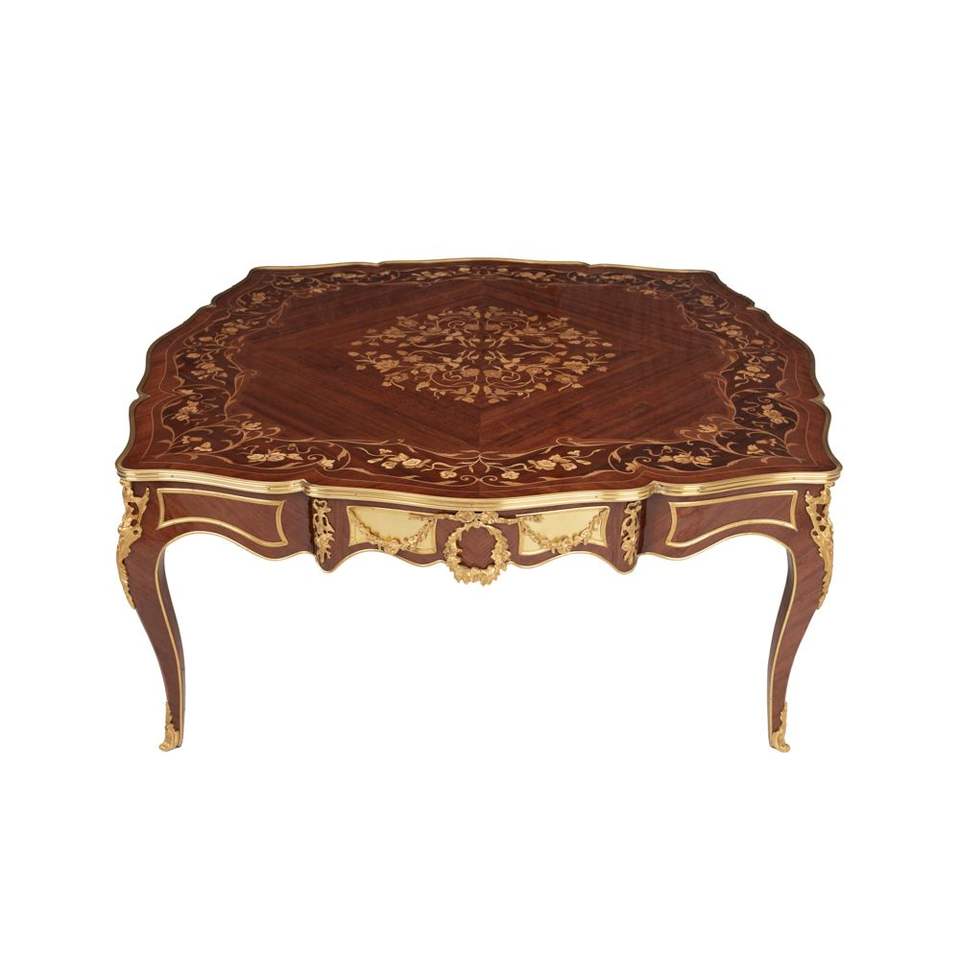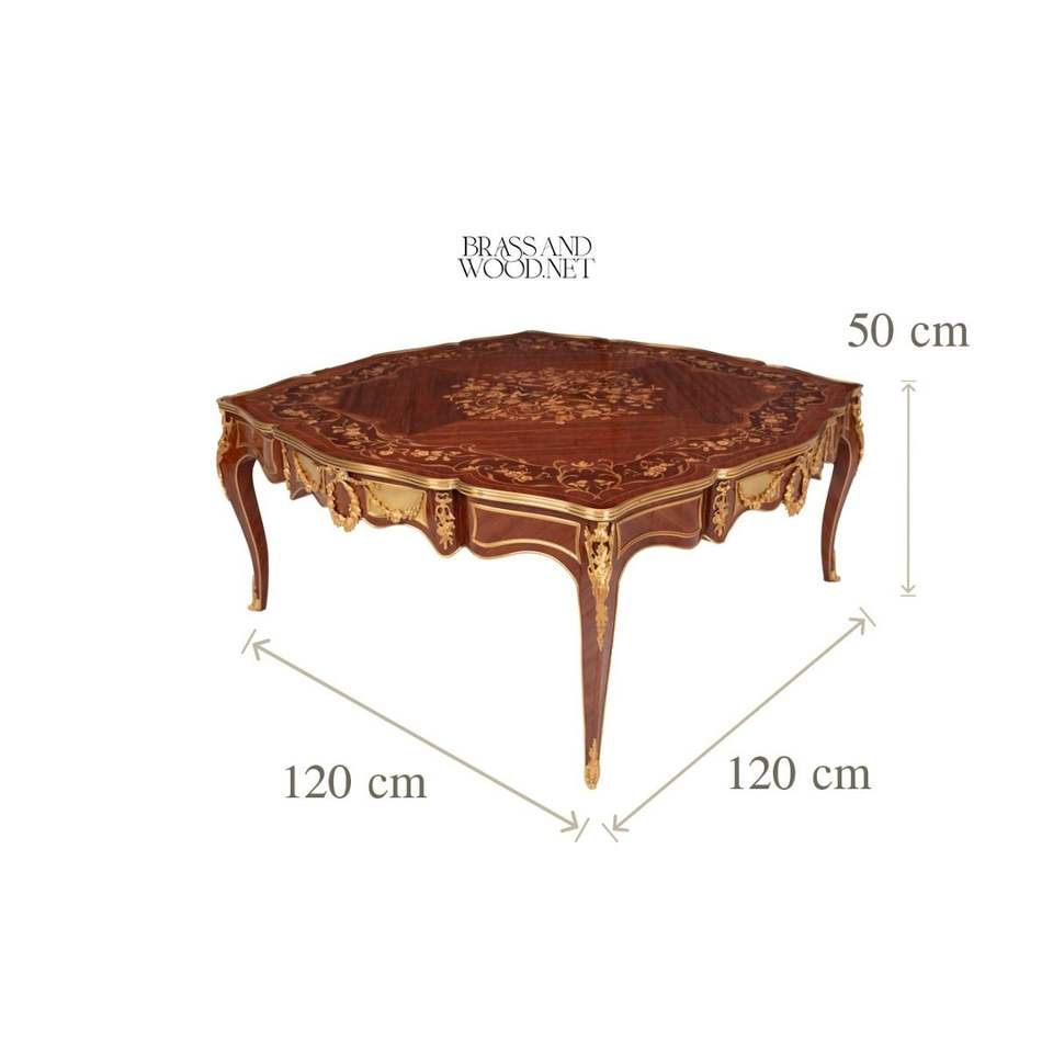 โต๊ะกาแฟทรงสี่เหลี่ยมหรูหรา พร้อมลายไม้สลักประณีตและขอบทองเหลืองสวยงาม สำหรับตกแต่งห้องนั่งเล่นอย่างมีสไตล์เหนือกาลเวลา