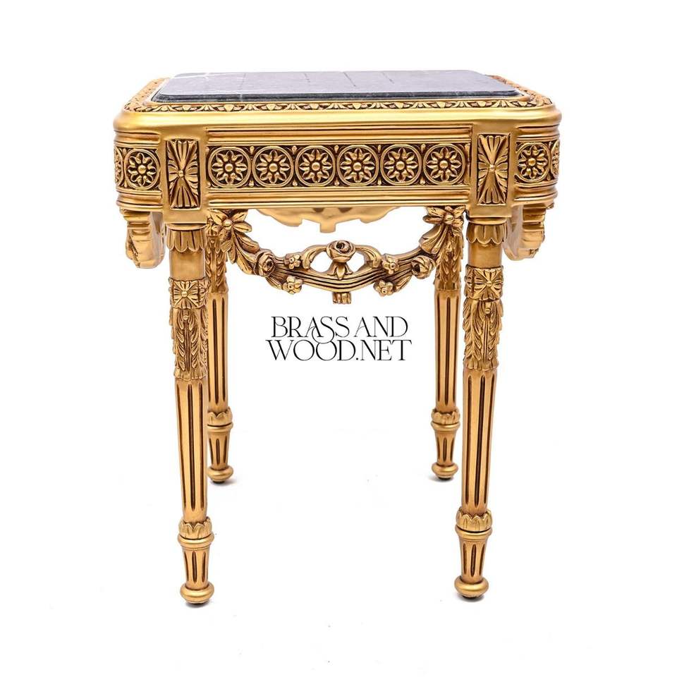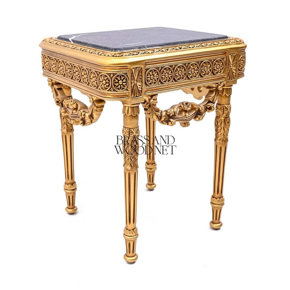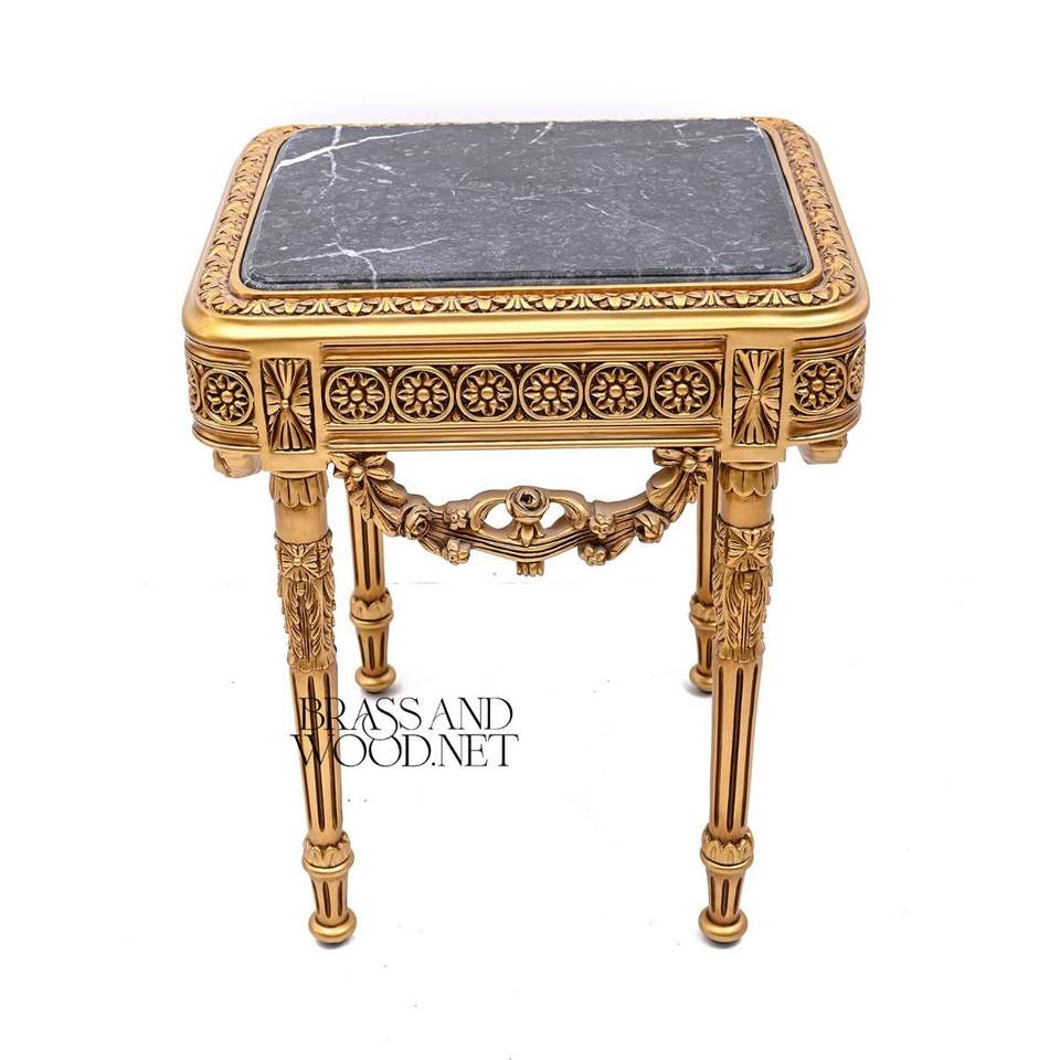 Luxury Square Gold Side Table with Premium Black Marble Top and Hand-Carved Neoclassical Details for Royal Palace Decor