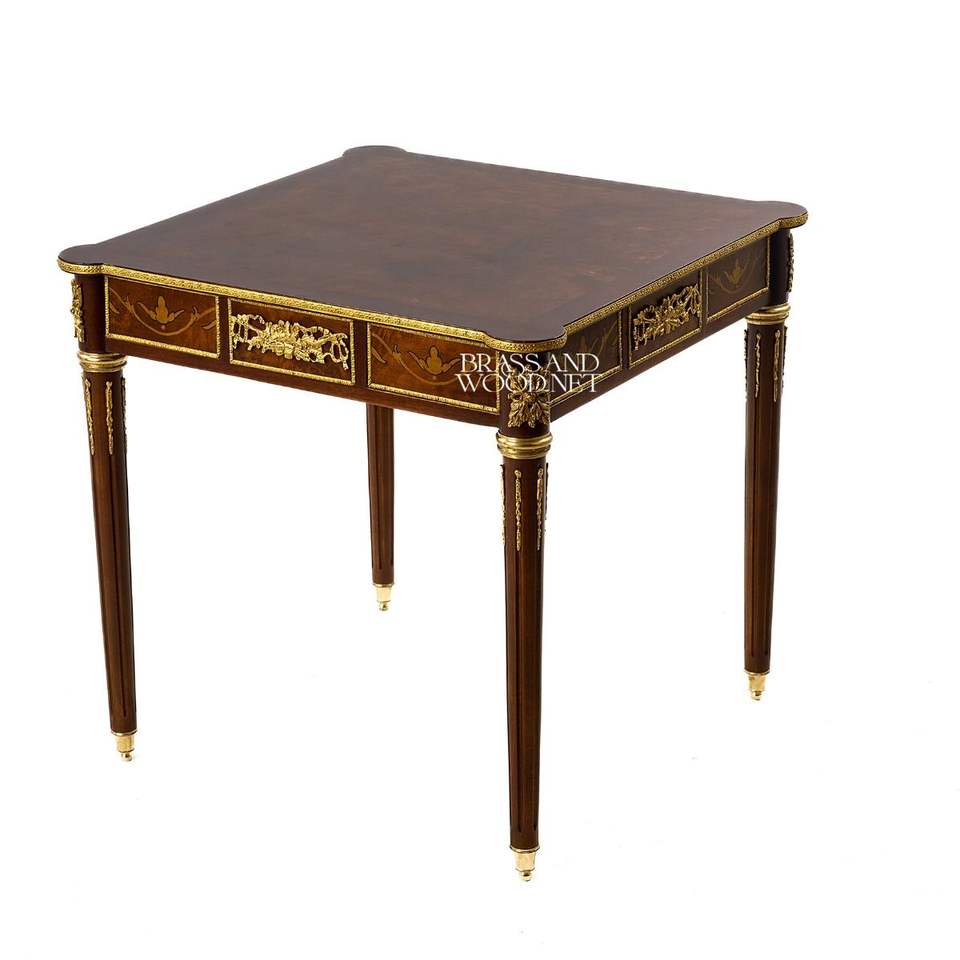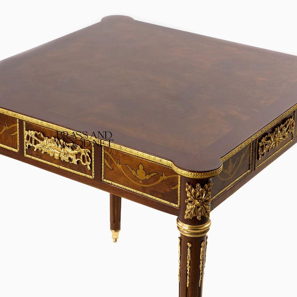 โต๊ะข้างทรงสี่เหลี่ยมหรูหราทำจากไม้มะฮอกกานี พร้อมลายไม้ฝังอย่างประณีต และเครื่องประดับทองเหลืองโบราณ สำหรับตกแต่งมุมบ้านสไตล์คลาสสิก