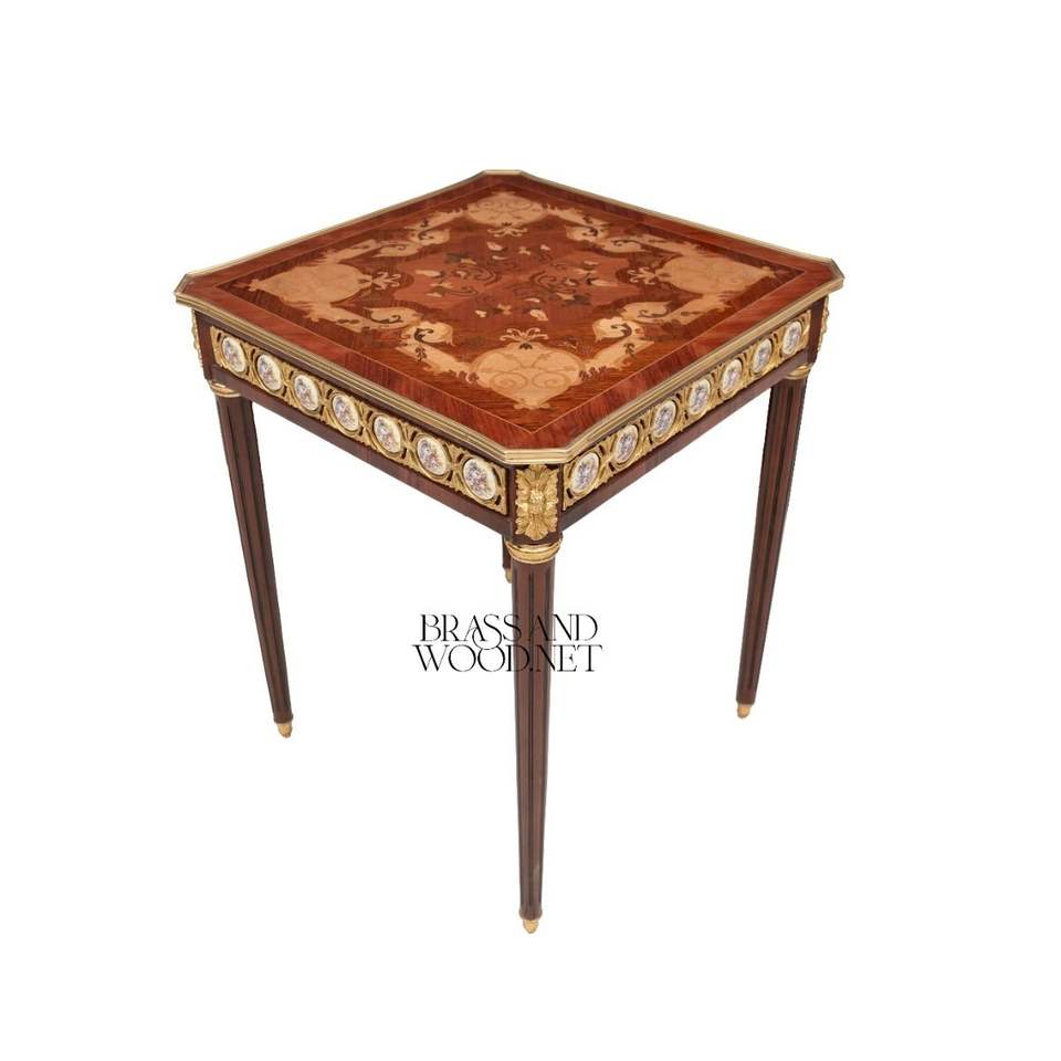 โต๊ะข้างทรงสี่เหลี่ยมหรูหรา พร้อมลวดลายเรขาคณิตประณีต ตกแต่งด้วยเหรียญพอร์ซเลนเพ้นท์มือ และของตกแต่งทองเหลืองสไตล์พระราชวัง