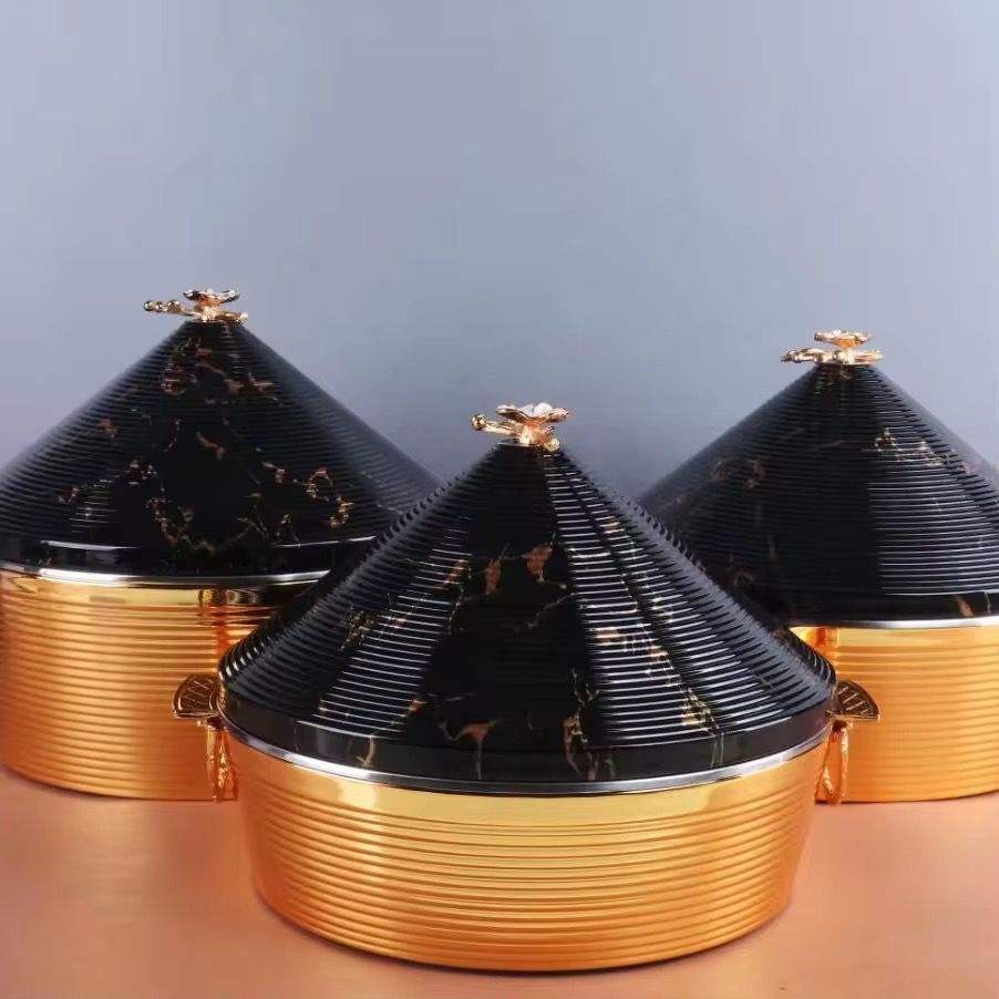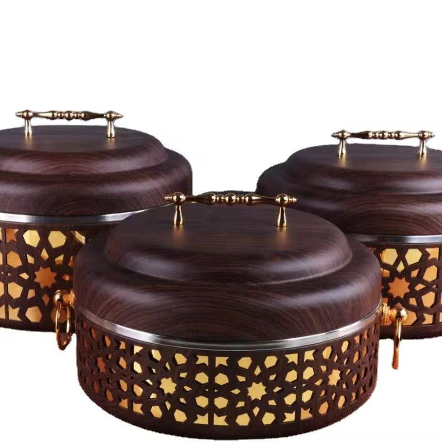ชุดอุ่นอาหารบุฟเฟ่ต์ทรงกลมพร้อมฝาปิดลายไม้ วัสดุสแตนเลสอย่างดี สำหรับงานจัดเลี้ยง