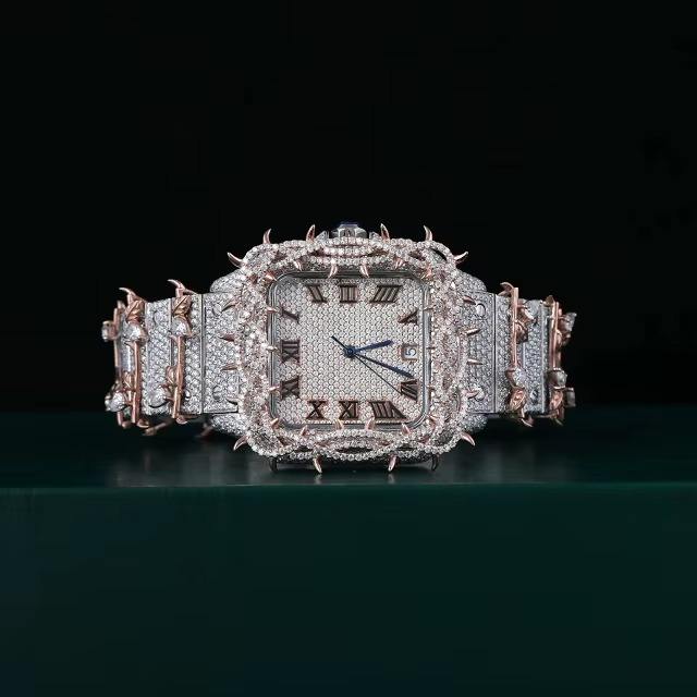 นาฬิกาหรูหราสไตล์ฮิปฮอป ตัวเรือนสแตนเลสสตีล ประดับเพชรโมซานไนต์ทรงกลมเต็มหน้าปัด ดีไซน์หน้าปัดลายหนาม สำหรับผู้ชายและผู้หญิง จากอินเดีย