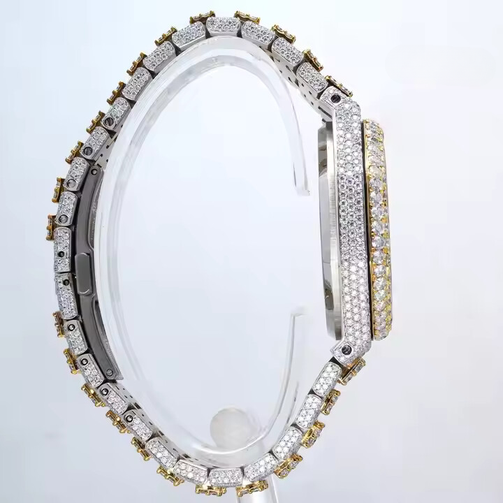 นาฬิกาเพชรโมอิสแบบอัตโนมัติสีทองการตั้งค่าข้อความหรูหราสำหรับผู้ชายและผู้หญิง