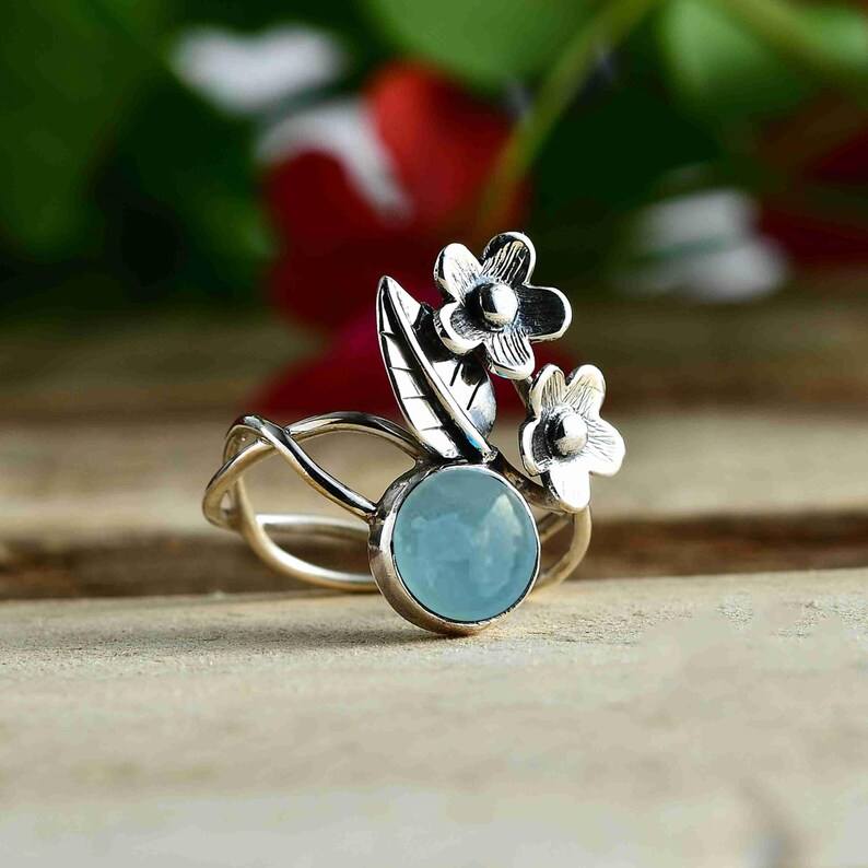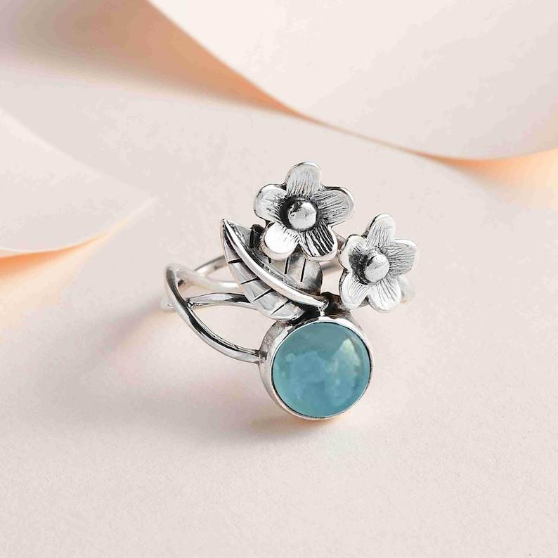 แหวนเงินอความารีนสุดหรูสำหรับผู้หญิงหินประจำเดือนเกิดอัญมณีกลมเล็กของขวัญสำหรับการหมั้น