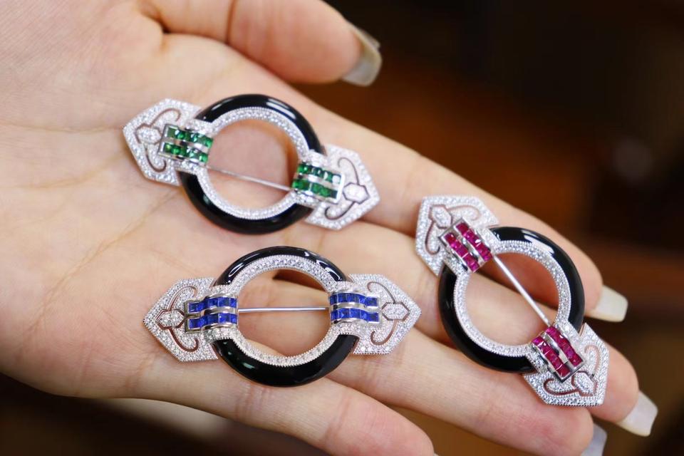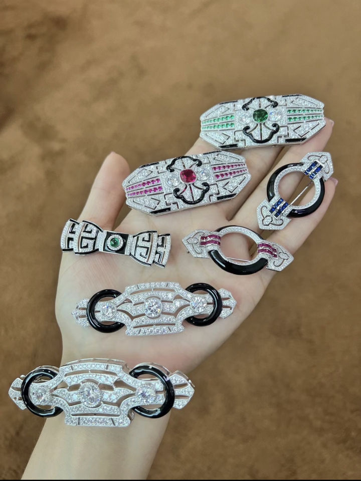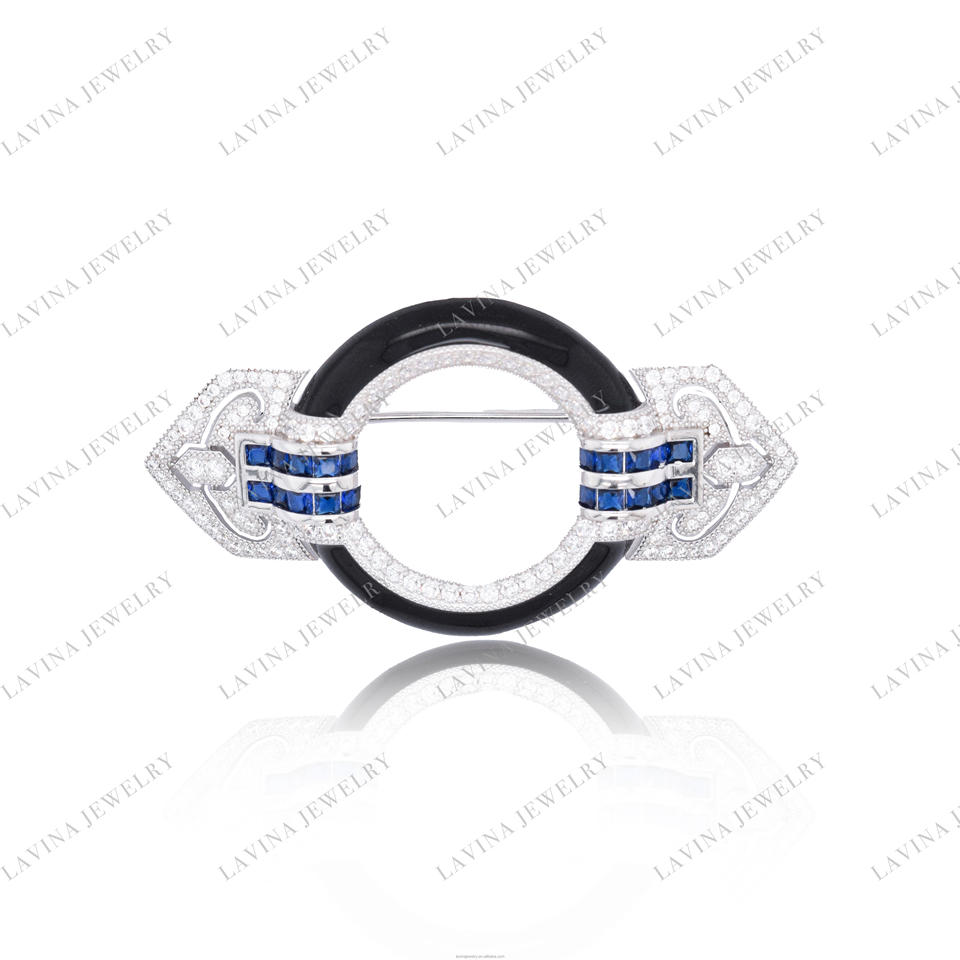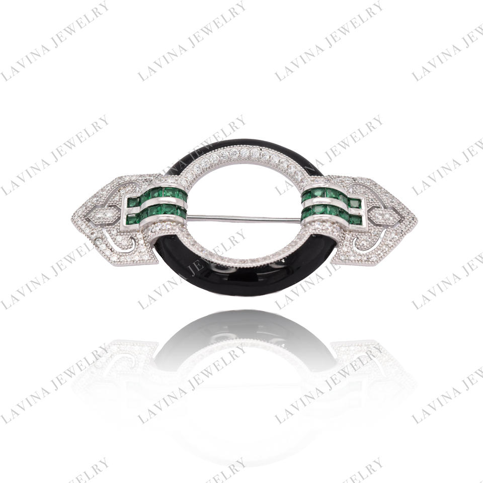 เข็มกลัดเงินแท้สไตล์วินเทจอาร์ตเดโค ประดับด้วยเคลือบเงาและเพชรดำขนาดเล็ก เหมาะสำหรับทั้งชายและหญิง ใช้เป็นเครื่องประดับสำหรับงานหมั้นหรืองานแต่งงาน