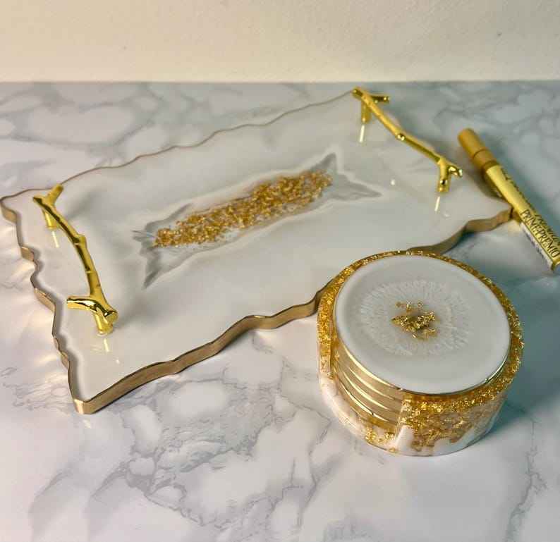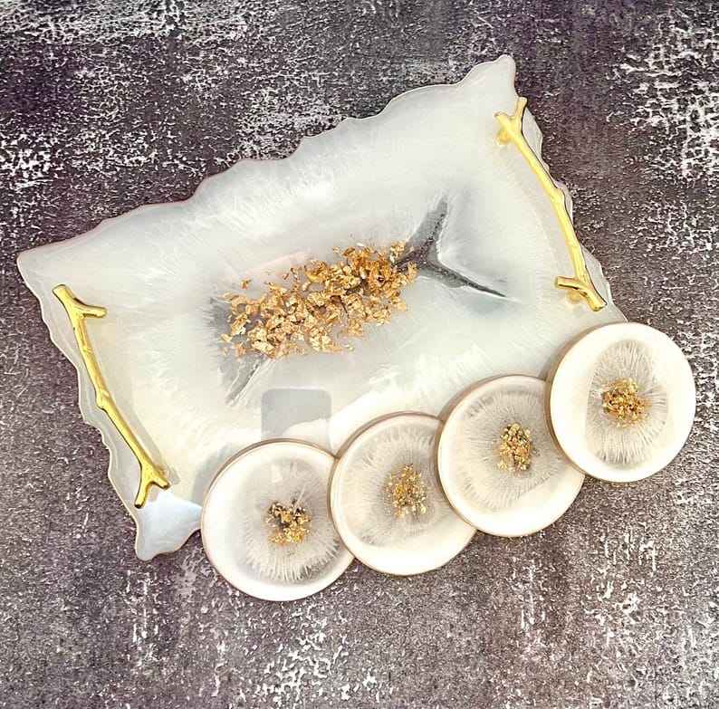 ถาดเรซิ่นสไตล์หรูหรา ผิวเรียบเนียน ดูเป็นงานฝีมือศิลปะ เหมาะสำหรับตกแต่งบ้าน ใช้เสิร์ฟ และเป็นของขวัญ