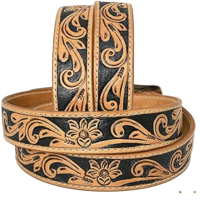 เข็มขัดหนังวัวแท้สีน้ำตาลแทนหนา ดีไซน์แบบตะวันตก พร้อมงานแกะสลักและเพ้นท์มือ งานหนังแกะสลักด้วยมือ ดีไซน์เนอร์