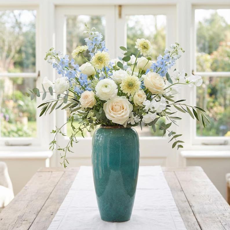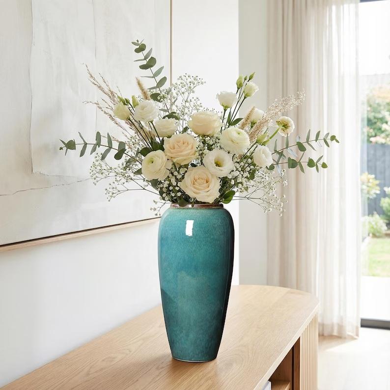 แจกันเซรามิกสีเขียวอมฟ้าสุดหรู พร้อมผิวเคลือบเงา รูปทรงสูงสง่างาม เหมาะสำหรับจัดดอกไม้และตกแต่งบ้านสไตล์โมเดิร์น