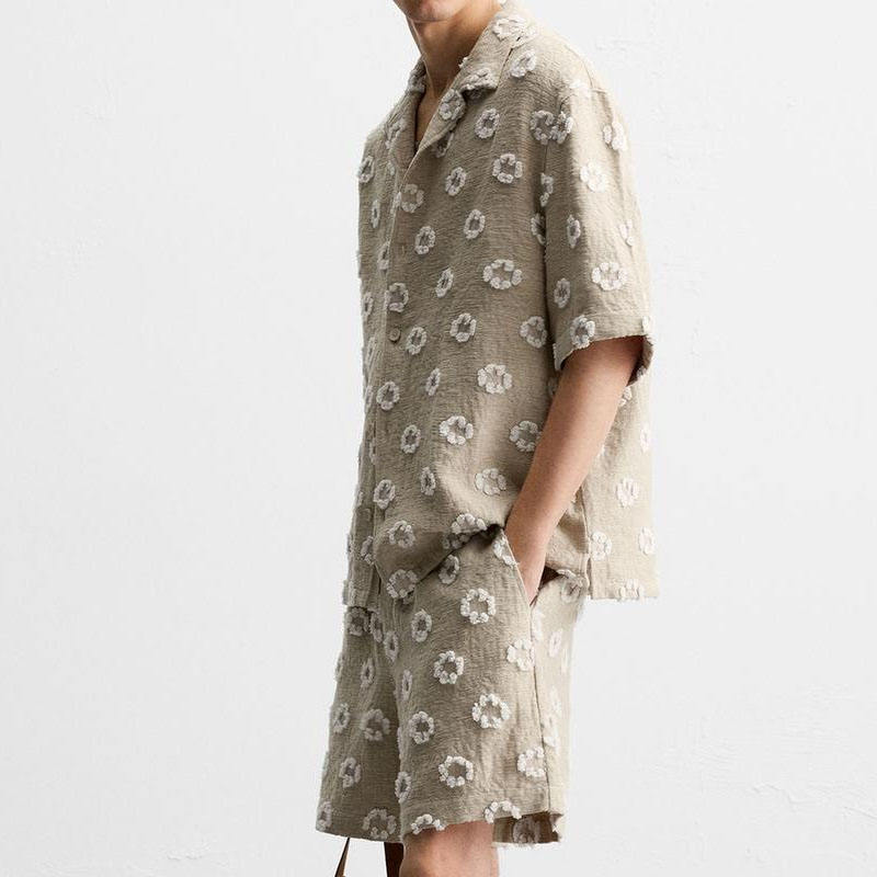 ชุดเสื้อคอปกคิวบาลายดอกไม้สำหรับผู้ชายผ้าปักสองชั้นและกางเกงขาสั้นเชือกผูกชุดชายหาดชุดสั้นสำหรับผู้ชาย