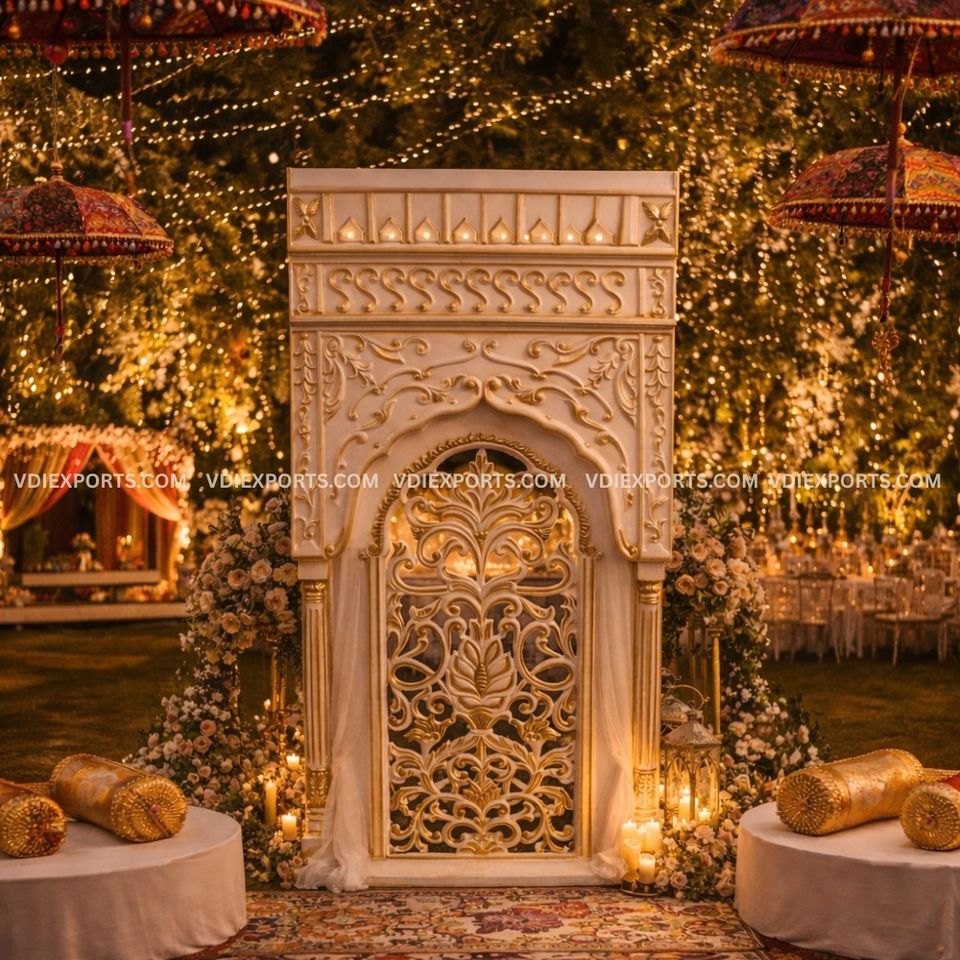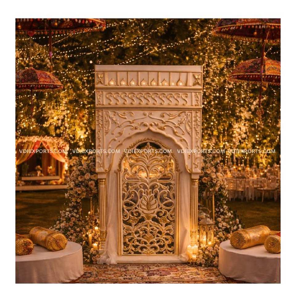 ฉากหลังแกะสลักแบบดั้งเดิมสุดหรูสำหรับตกแต่งเวทีงานแต่งงานแบบอินเดียและงานพรีเมียม