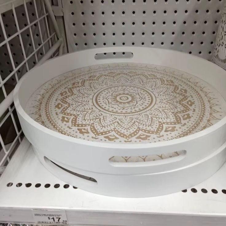 ถาดเสิร์ฟไม้ทรงกลมสีขาวหรูหรา ลายแมนดาลาสีทอง สำหรับโต๊ะกาแฟ พร้อมหูจับ ของตกแต่งครัว ชุดของขวัญขายส่ง