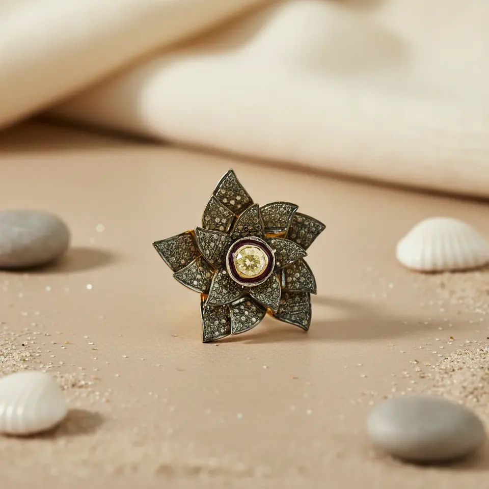 แหวนสแตนเลสสตีลทรงดอกไม้ชุบทองคำสีกุหลาบประดับเพชรสำหรับผู้หญิง ดีไซน์หรูหราทันสมัย รุ่น ADR-20015