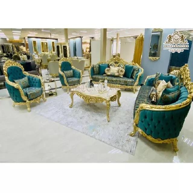 ชุดโซฟาห้องนั่งเล่นสไตล์บาร็อคโมเดิร์นแบบตุรกีสุดหรู ทำจากไม้สักคุณภาพสูง ตกแต่งด้วยสีทอง ทนทาน ขนาดสั่งทำได้