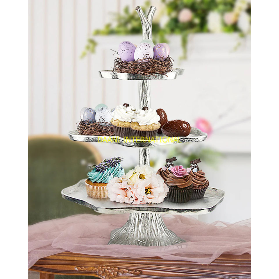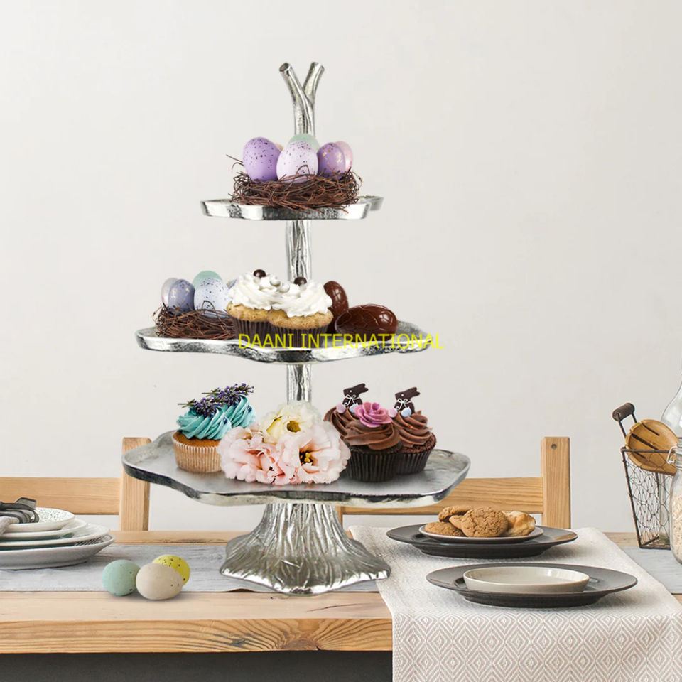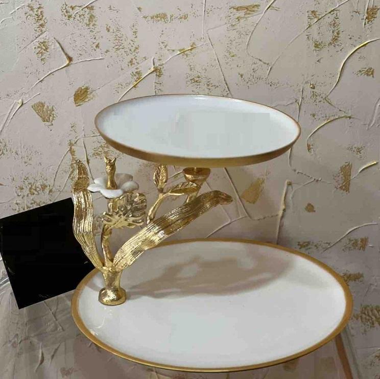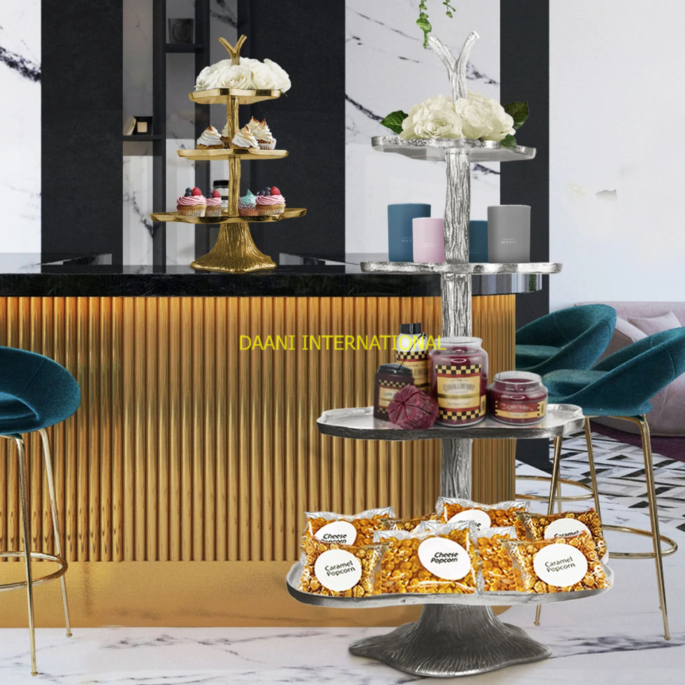 แท่นวางเค้กอลูมิเนียมสองชั้นสุดหรูพร้อมดีไซน์ดอกไม้โลหะสีทองแท่นวางโชว์ขนมทำมือสำหรับงานแต่งงานอุปกรณ์ทำเค้ก
