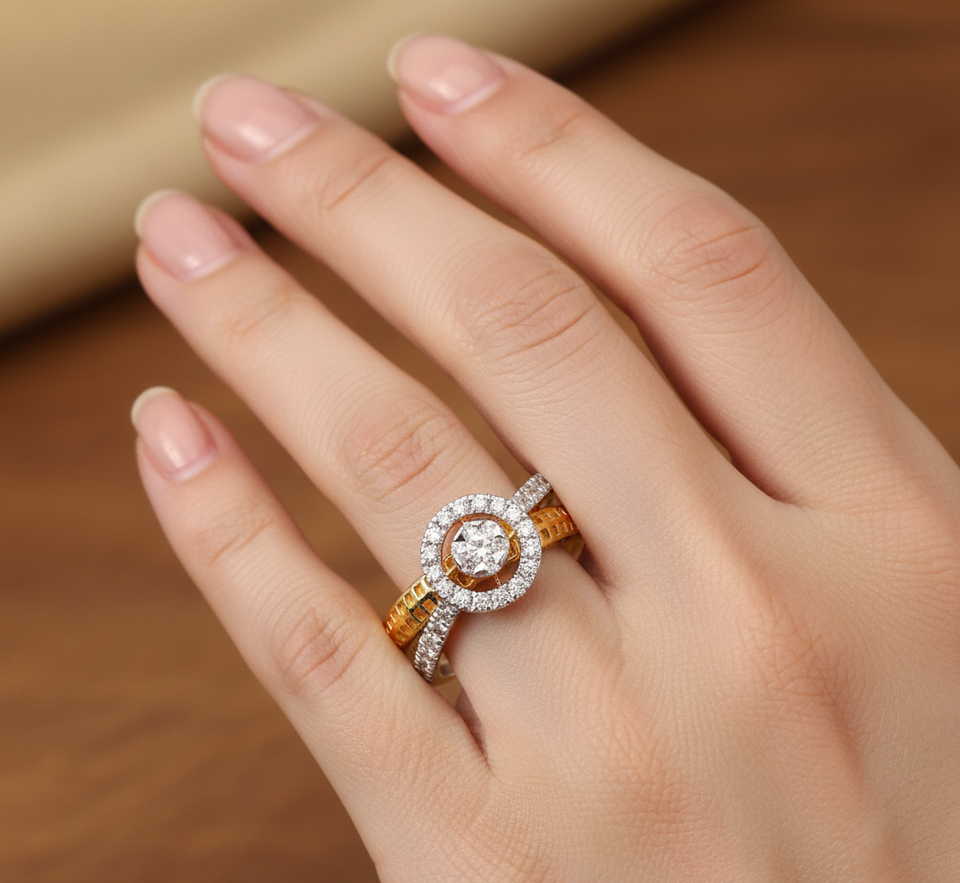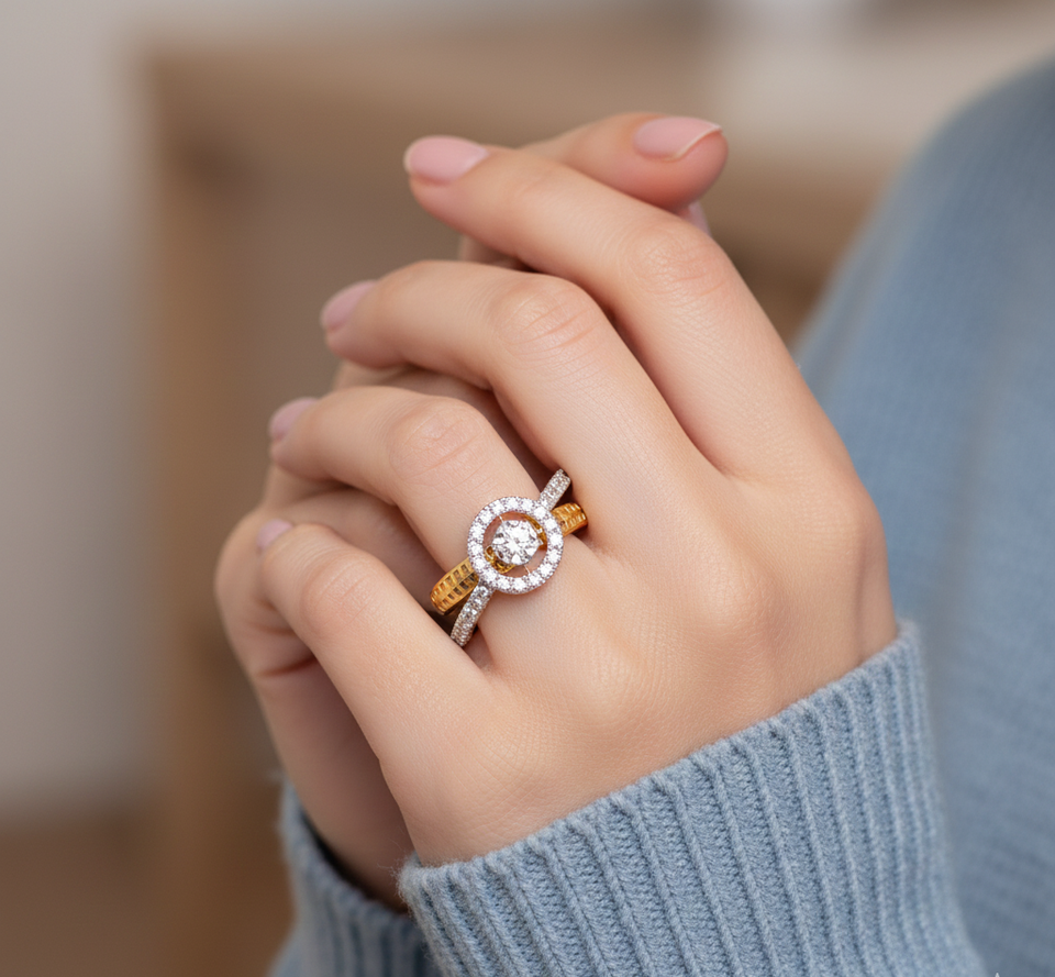 แหวนทองสองสีหรูหราแบบไขว้ พร้อมแหวนหมั้นทรงกลมแบบ Halo สำหรับผู้หญิง