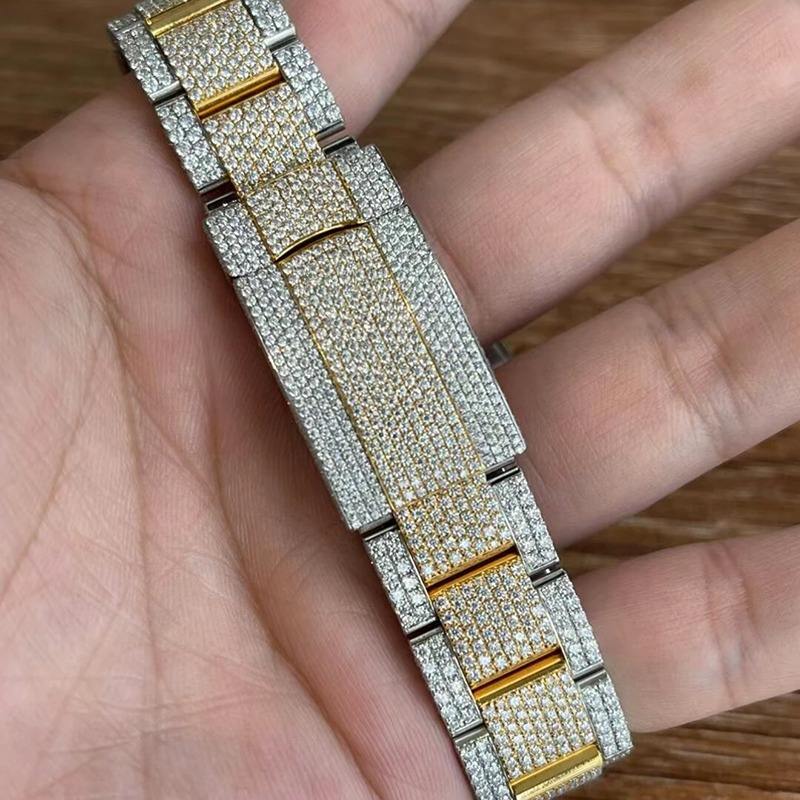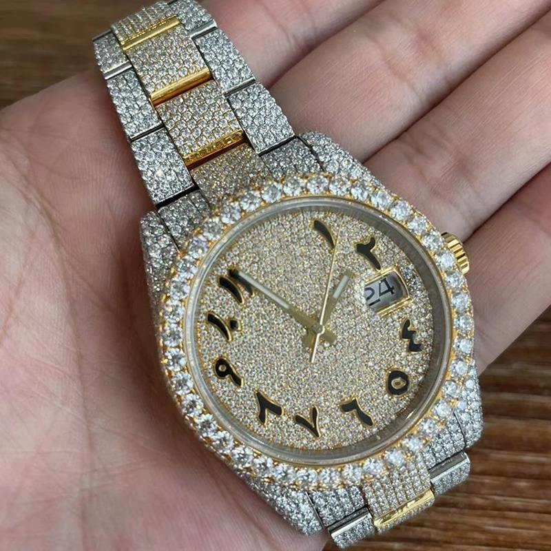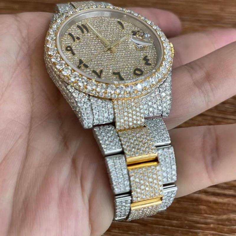 นาฬิกาฮิปฮอปหรูหราสองสีประดับเพชรโมอิสซาไนต์ VVS หน้าปัดแบบอารบิก ตัวเรือนสแตนเลสสตีล ระบบควอตซ์ ETA สำหรับผู้ชาย