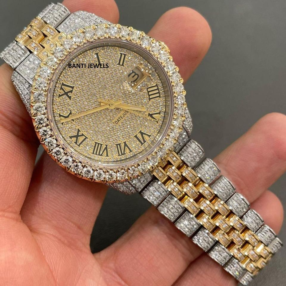 นาฬิกาหรูหราสองสี สแตนเลสสตีล ประดับเพชรโมอิสซาไนต์ ขอบเพชร ระบบกลไกคู่ สำหรับทุกเพศ สไตล์ฮิปฮอป เครื่องประดับระดับพรีเมียม ดีไซน์วิบวับ