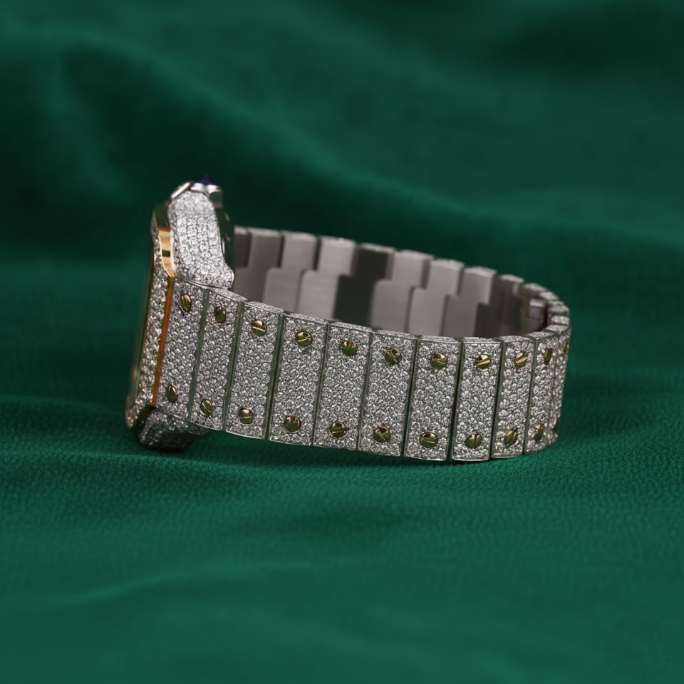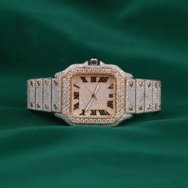 นาฬิกาหรูสองสีโรสโกลด์และสีเงิน ประดับเพชรโมอิสซาไนต์สำหรับผู้ชาย ดีไซน์ขอบหน้าปัดสี่เหลี่ยมแบบสกรู ระบบอัตโนมัติ พร้อมฟังก์ชั่นวันที่ ระดับความสะอาด VVS