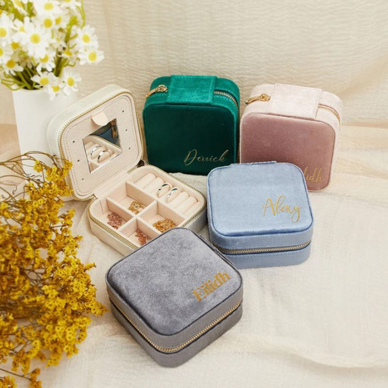 กระเป๋าเครื่องประดับกำมะหยี่หรูหรามีซิปสำหรับเดินทางกล่องเก็บเครื่องประดับสีแดงพร้อมกระจกต่างหูขนาดเล็กสร้อยคอกล่องของขวัญเครื่องประดับ