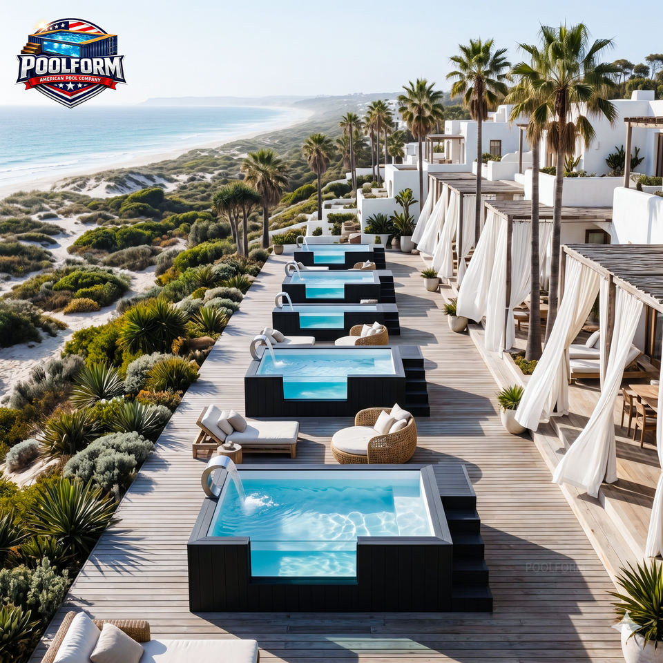 สระว่ายน้ำไฟเบอร์กลาสสำเร็จรูปแบบโมดูลาร์ ดีไซน์น้ำหนักเบา ตั้งบนพื้นดิน พร้อมดาดฟ้าบนหลังคา
