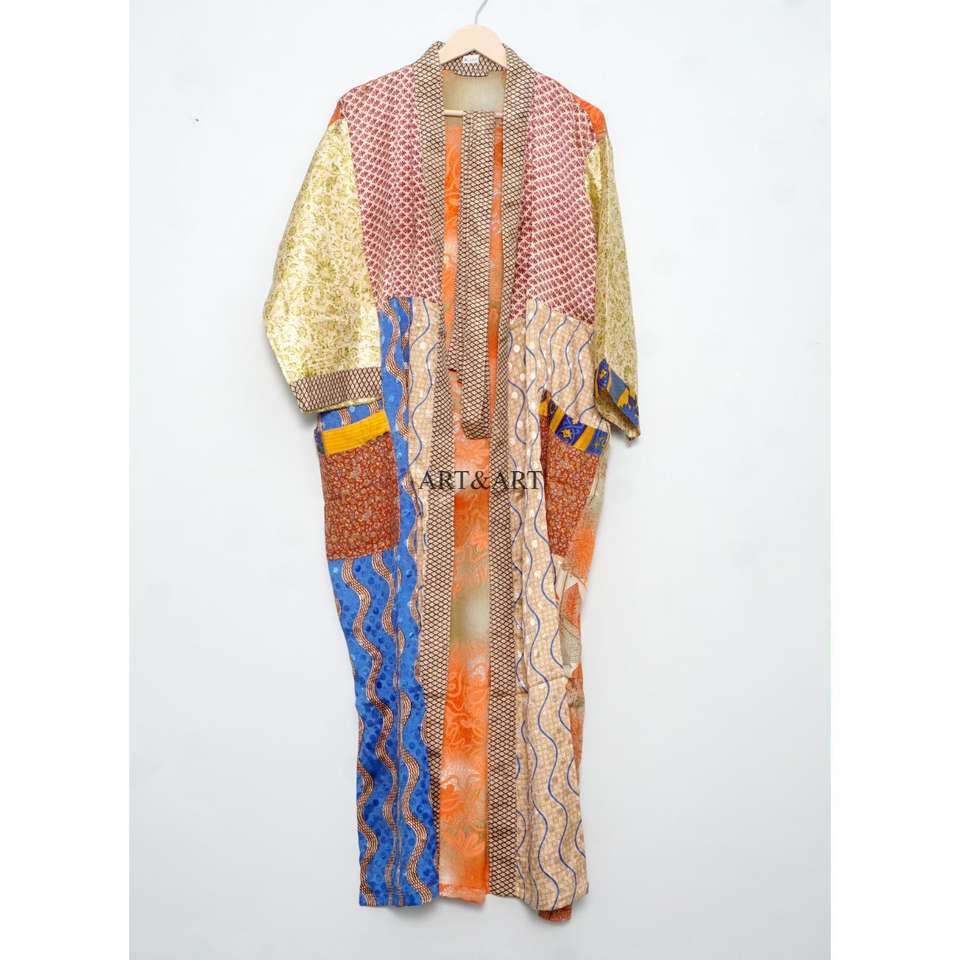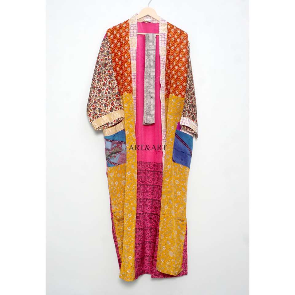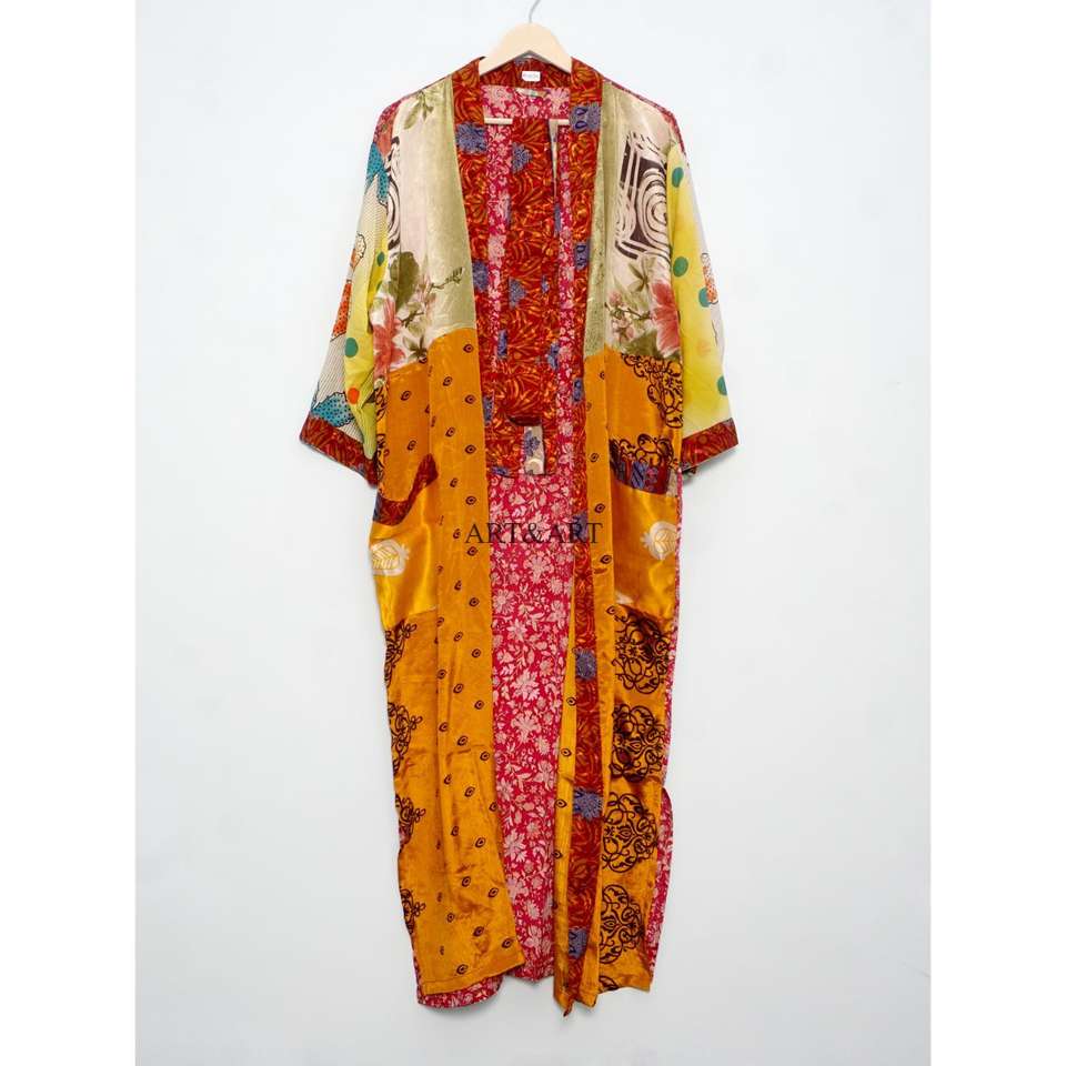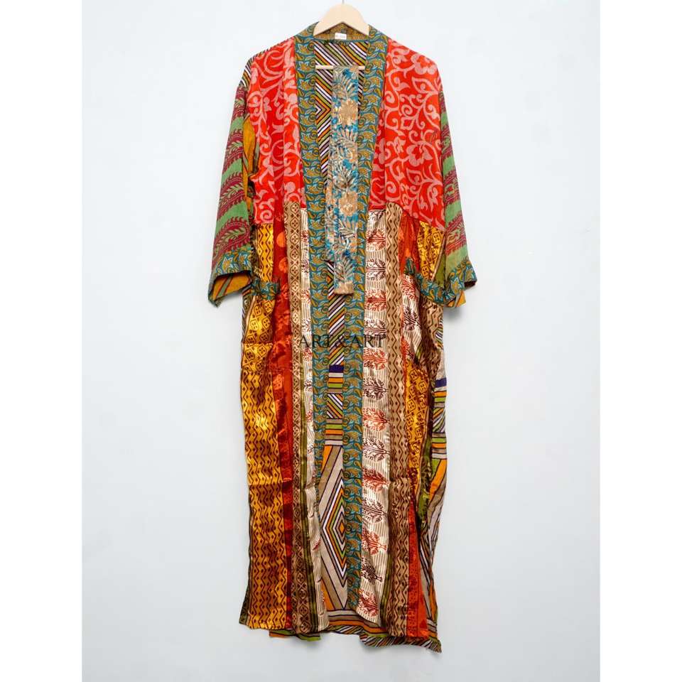 ชุดคลุมผ้าไหมซารีวินเทจสุดหรูสำหรับผู้หญิง | เสื้อผ้าไหมพิมพ์ลายดอกไม้ทำมือ คอวี ปิดด้วยเชือกผูก แขนสามส่วน