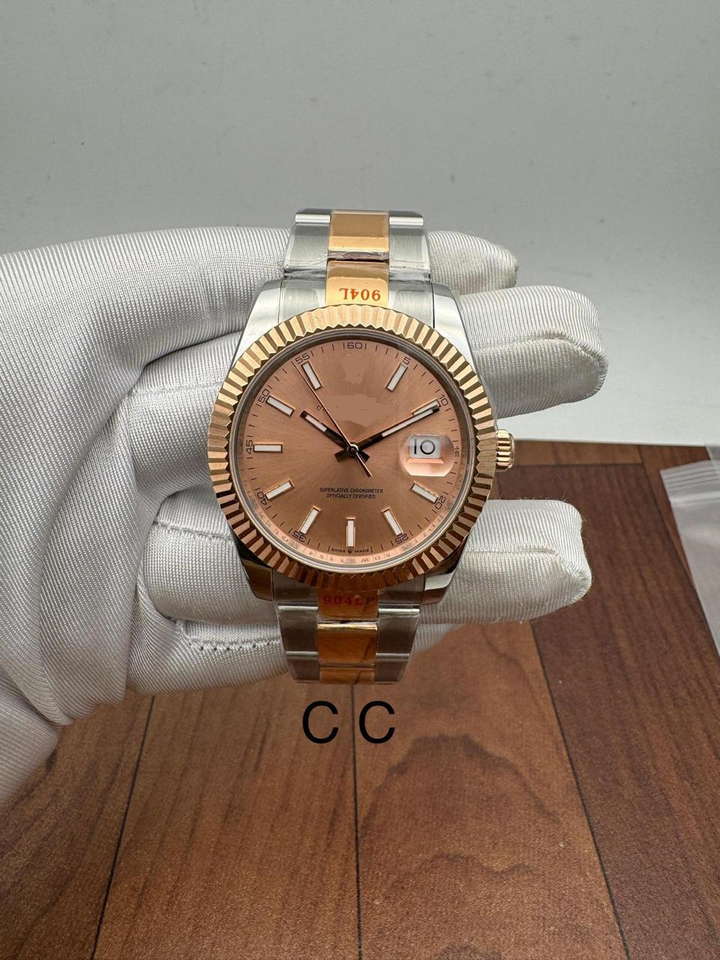 นาฬิกาวินเทจสุดหรู ตัวเรือนสองสีโรสโกลด์ลายฟลูต หน้าปัดสีช็อกโกแลตซันเบิร์ส พร้อมช่องแสดงวันที่ และกลไกอัตโนมัติ ETA MOVEMENT