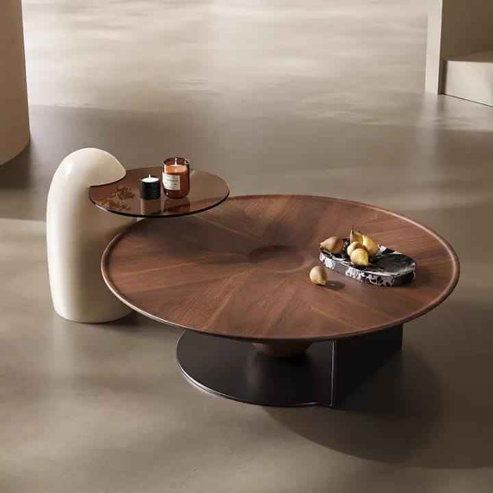 โต๊ะกาแฟวอลนัทลายซันเบิร์สต์สุดหรู พร้อมถาดหมุนข้าง โต๊ะกลางดีไซน์เนอร์ทันสมัยอเนกประสงค์ ทำจากไม้และโลหะ
