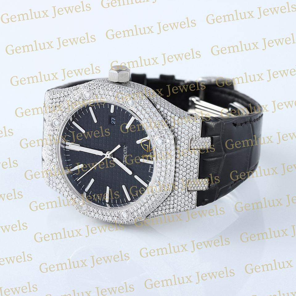นาฬิกาสายรัดยางสีดำสำหรับผู้ชายเครื่องทดสอบเพชรผ่านวันที่แบบสวมสุดหรูหน้าปัดเพชรสีดำ VVS เพชร