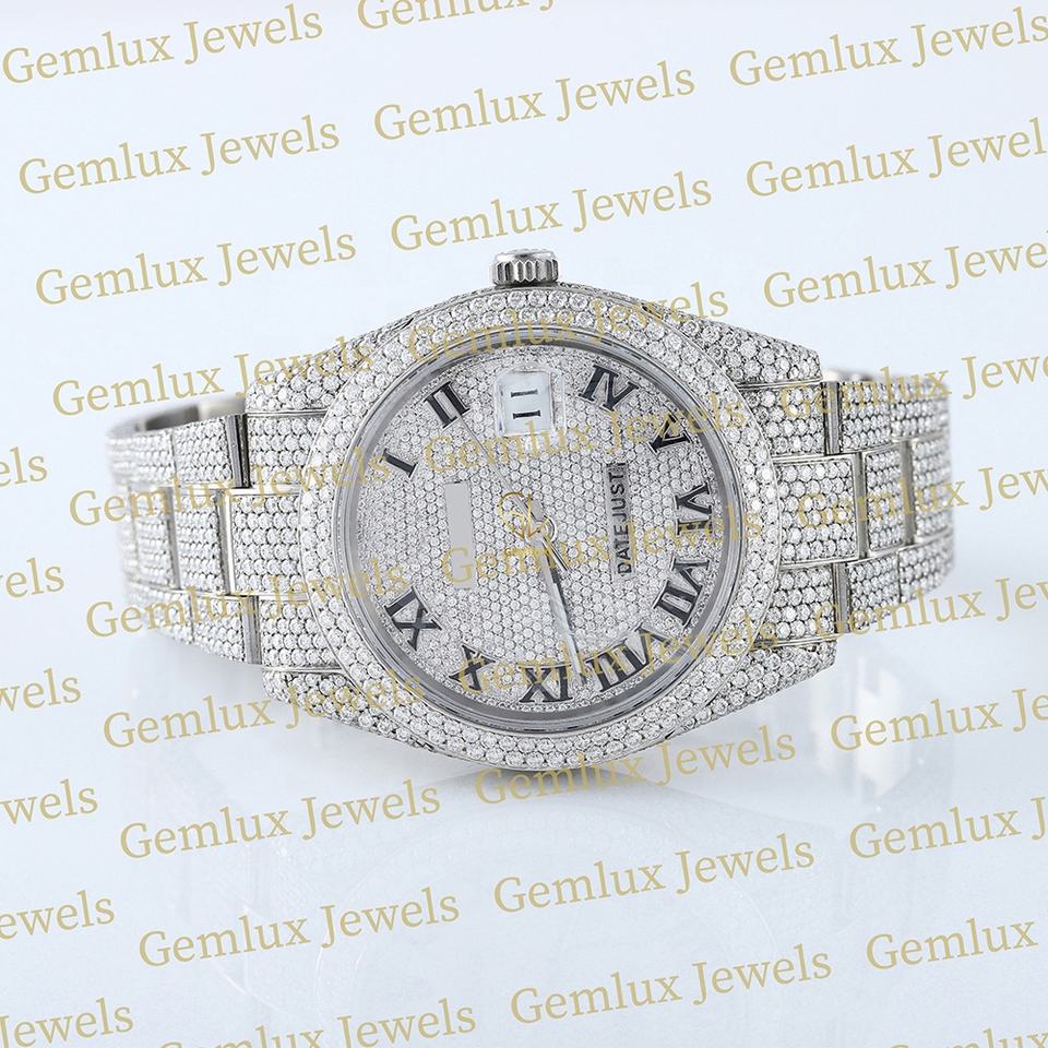 นาฬิกาข้อมือสุดหรูลายเพชรประดับเพชรหน้าปัดโรมัน D VVS เพชรโมอิสสีขาวเต็มรูปแบบวันที่อัตโนมัตินาฬิกาฮิปฮอปของผู้ชาย