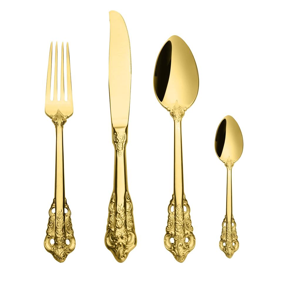 ชุดมีด4ชิ้นชุบสีทองสุดหรูสำหรับงานแต่งงานชุดเครื่องใช้บนโต๊ะอาหารสแตนเลสชุดเครื่องใช้บนโต๊ะอาหารสีทองไทเทเนียมมิเรอร์เหล็ก