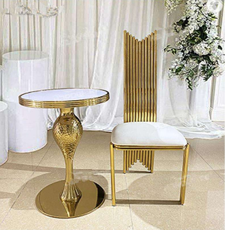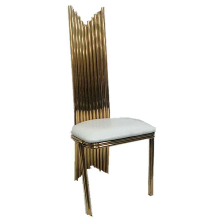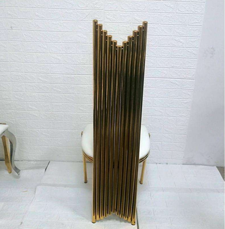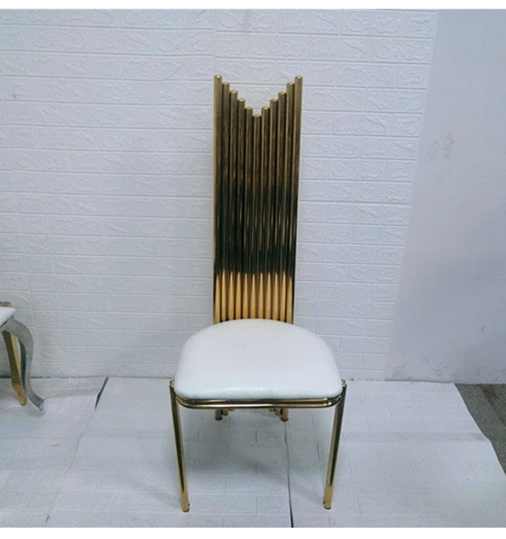 เก้าอี้รับประทานอาหารสแตนเลสด้านหลังสูงหรูหราเก้าอี้จัดเลี้ยงงานแต่งงานวางซ้อนกันได้สีทอง