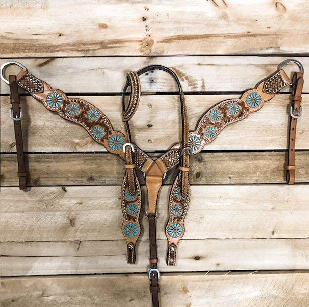 Luxury Western Horse Tack Set Premium Design Hand Tooled Turquoise Daisy One Ear Headstall and Breastcollar Set