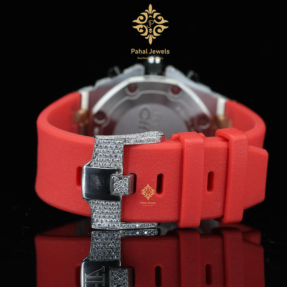 นาฬิกาอัตโนมัติหรูหราสีขาวทอง ดีไซน์แบบฮิปฮอปสุดหรู พร้อมหน้าปัดสีแดงทำมือและสายยางแบบสั่งทำพิเศษ