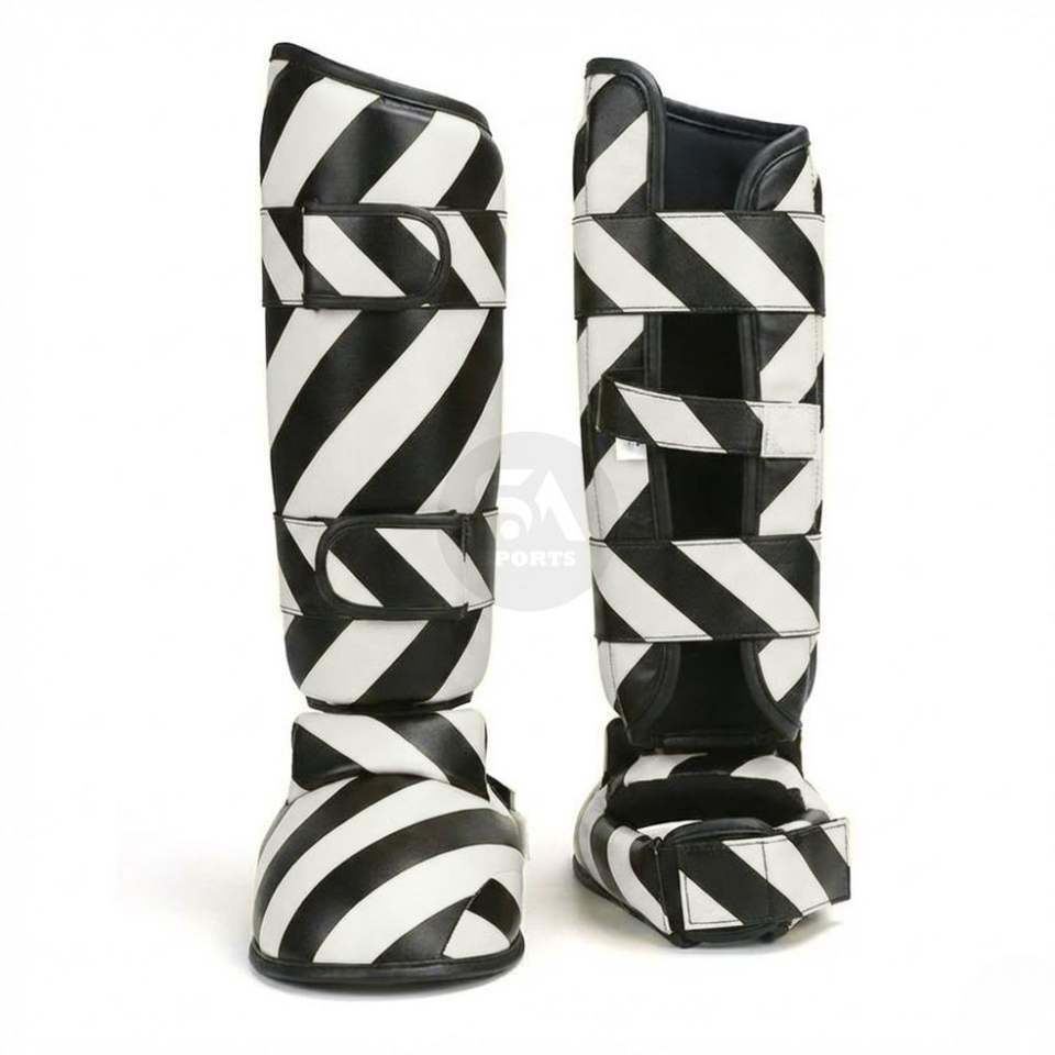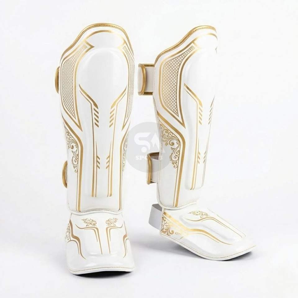 สนับแข้งมวยไทยสีขาวทองหรูหรา สำหรับมืออาชีพ คิกบ็อกซิ่ง MMA อุปกรณ์ฝึกซ้อม หนังไมโครไฟเบอร์ PU บุสามชั้น