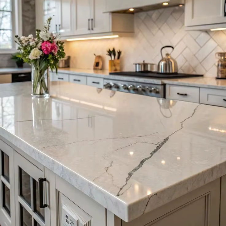 เคาน์เตอร์ครัวหินอ่อนสีขาวแบบโมเดิร์นหรูหราพร้อมขอบเอียง