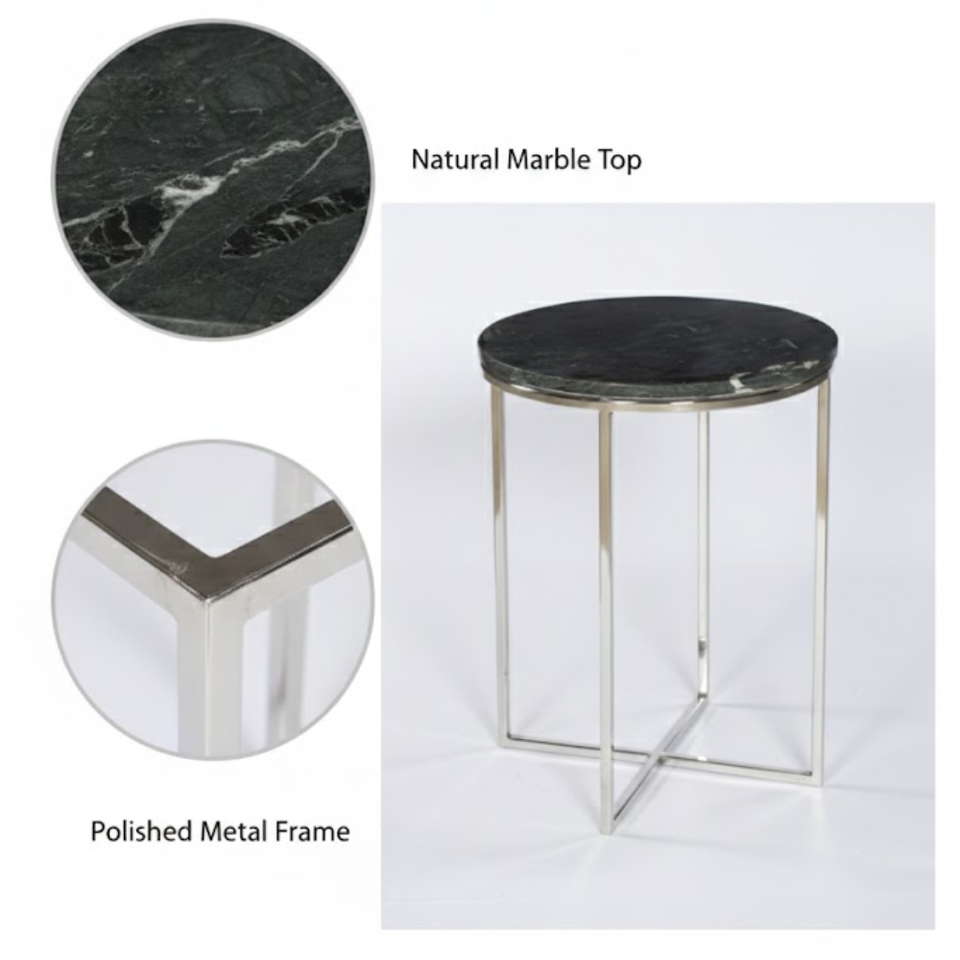โต๊ะข้างทรงกลมหน้าหินอ่อนสีขาวหรูหราพร้อมโครงเหล็กสแตนเลสทรงเรียบหรู | โต๊ะข้างโซฟาสมัยใหม่สำหรับตกแต่งห้องนั่งเล่นและอพาร์ตเมนต์