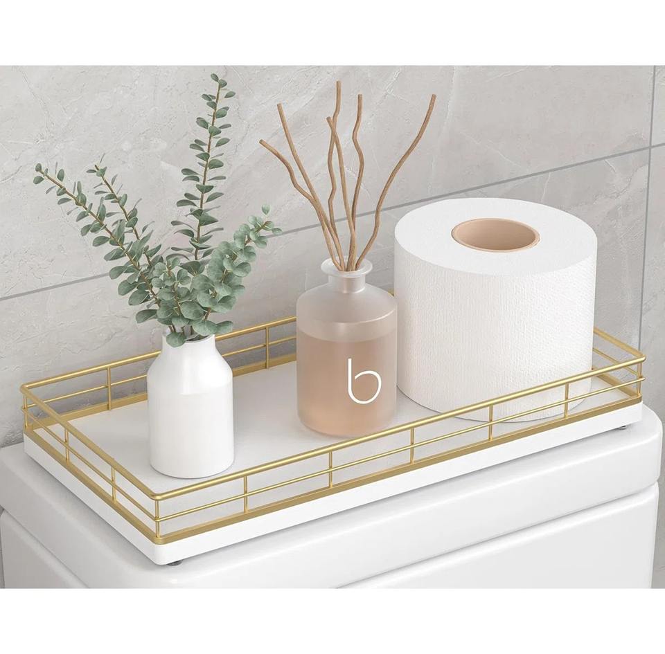 ถาดวางของบนโถสุขภัณฑ์ไม้โอ๊คสีขาวสุดหรู พร้อมขอบลวดสีทองอย่างประณีต เพื่อการจัดเก็บในห้องน้ำอย่างมีระดับ