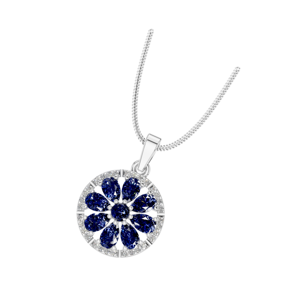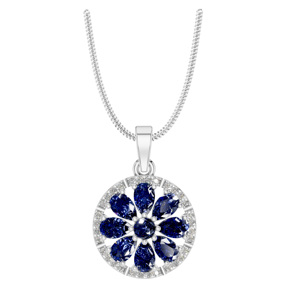 Round Floral Pendant with Blue Sapphire Petals and Diamond Halo