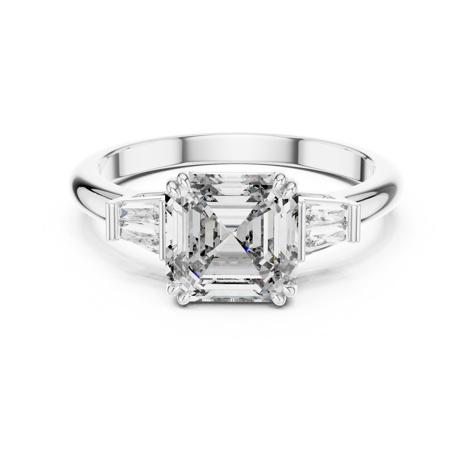 แหวนเพชรทรง Asscher สำหรับผู้หญิงสุดหรู เพชรเลี้ยงในห้องปฏิบัติการ 3 เม็ด ประดับเพชรทรงบาแก็ตต์ด้านข้าง ชุบทองคำขาว 18K รับรองโดย IGI สี E