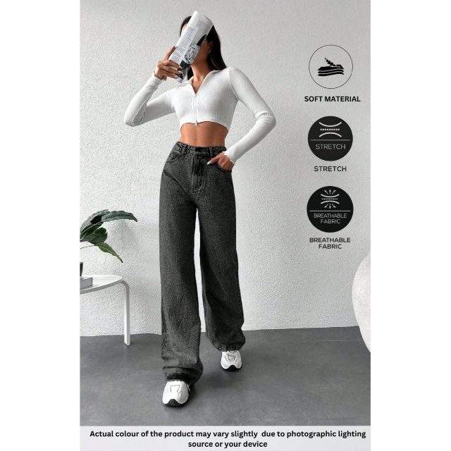 Fit Type: Wide Leg / Loose Fit, Waist Type: High Waist, Fabric: Stretch Denim (Cotton + Stretch Denim), Length: Full Length (Approx. 40 inches), Closure Type: Zipper Fly with Metal Button, Pattern Type: Solid / Plain, Pocket Type: 5-Pocket Classic Design, Stitching: Double-Needle Durable Stitch, Details: Clean Look / Minimalist Finish / Premium Thread Work, Fabric Features: Soft Stretch/ Eco-Friendly/ Durable/ Breathable, Wash Type: Enzyme Wash / Soft Finish, Usage: Casual Wear/ Street Style/ Daily Comfort