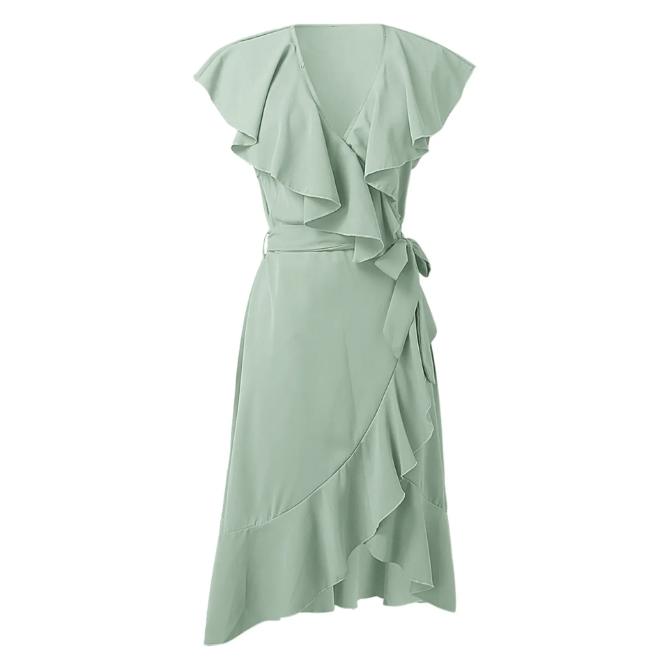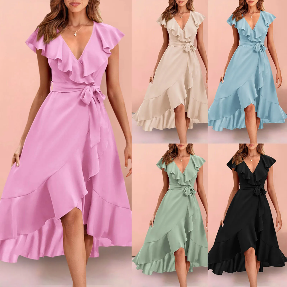 Luxury Women's Summer Elegant Mid-Length Dress Casual Boho Style with Deep V-Neck Short Sleeve Solid Color Dress