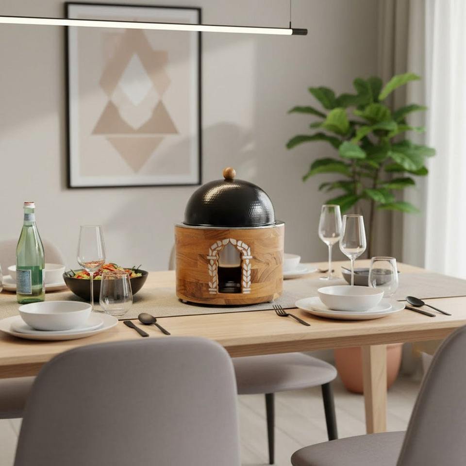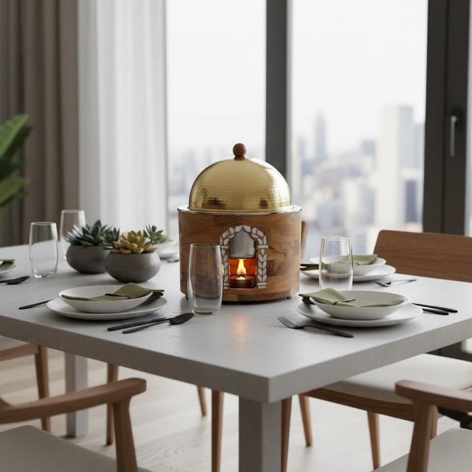 ถาดอุ่นอาหารทรงกลมฐานไม้หรูหรา ฝาปิดสีทองลายตอก พร้อมเครื่องอุ่นอาหารสแตนเลส สำหรับบุฟเฟ่ต์ระดับพรีเมียมและการจัดเลี้ยงที่บ้าน