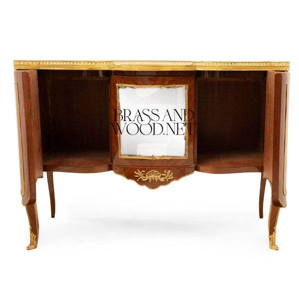 โต๊ะคอนโซลไม้หรูหราพร้อมแผงกระจกตรงกลาง ตกแต่งด้วยทองเหลือง สไตล์ฝรั่งเศสคลาสสิก ดีไซน์ท็อปหินอ่อน