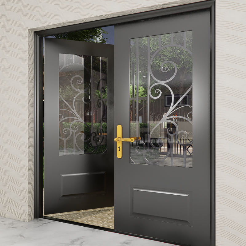 ประตูเหล็กดัดภายนอกสุดหรูพร้อมประตูกระจกตกแต่งประตูรักษาความปลอดภัยแบบกำหนดเองและประตูเหล็กที่แข็งแรงสำหรับบ้านสมัยใหม่