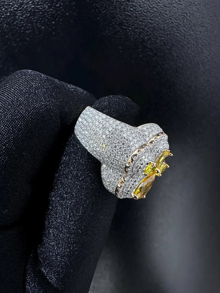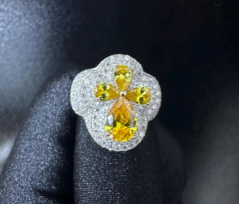 แหวนดีไซน์ดอกไม้ประดับเพชรโมอิสซาไนต์สีเหลืองหรูหรา ทำจากเงินแท้ 925 แหวนโดดเด่นระยิบระยับสำหรับผู้หญิง